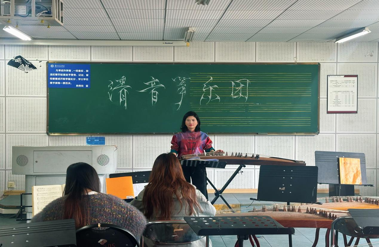 陈玉莲老师展示的示范课程是《器乐教学与演奏Ⅲ》,授课对象是2022级音乐学专业学生。课上,陈老师生动地讲解了古筝艺术歌曲的独特文化内涵,从基础理论到演奏技巧,深入浅出。现场演示环节更是吸引眼球,教师熟练地展示了乐器演奏,美妙音符萦绕教室。针对学生在弹奏中出现的问题进行针对性的指导,并选取伴奏音乐片段进行示范弹奏和讲解,取得了良好的教学效果。