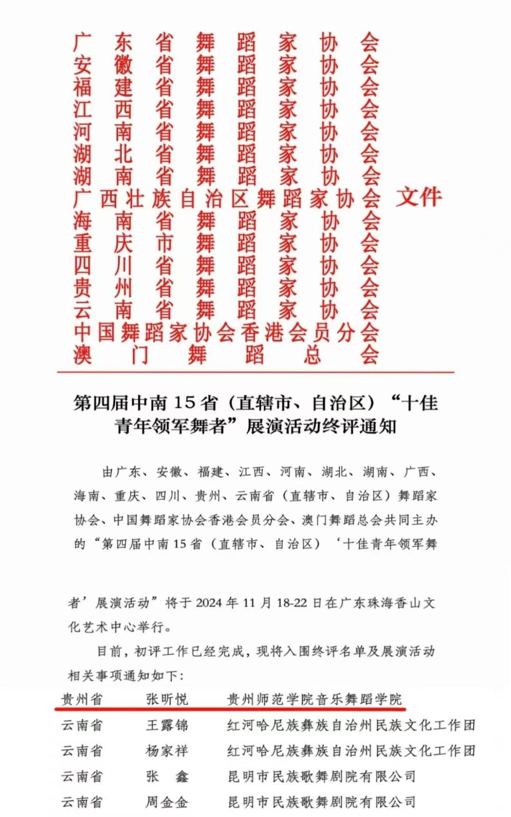 2024 年 10 月 31 日,第四届中南15省十佳青年领军舞者”展演活动终评通知发布,我院青年教师张昕悦成功入围。