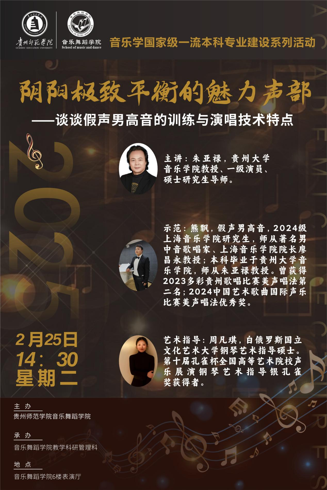 2月25日下午,贵州大学音乐学院朱亚禄教授在我院举办声乐学术讲座,讲座题目为“阴阳极致平衡的魅力声部——谈谈假声男高音的训练与演唱技术特点”。本次讲座由王晓副院长主持。原贵州省文化厅副厅长、民进贵州省委副主委、贵州省文化艺术促进会会长谢彬如先生与贵阳市市管专家、国家一级编导、贵阳市文化馆高级馆员邹海莲老师作为特邀嘉宾也来到现场,与音乐系师生一起聆听讲座。