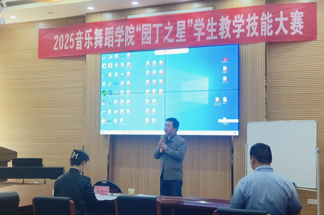 音乐组的决赛于16日下午在学院六楼会议室隆重举行,2022、2023级音乐学专业共18名同学参加了比赛。为保证比赛成绩公平、公正、专业,学院邀请了来自乌当区教育科研与教师培训中心、乌当区第四中学等优秀一线音乐教师和教研员担任比赛评委。比赛正式开始前,学院副院长王晓来到赛场热情致辞,对进入“园丁之星”决赛的同学表示祝贺,对在百忙之中前来我院担任评委工作的一线老师们表示感谢。他强调了课堂教学技能对于音乐师范生专业能力发展的重要性,希望参加比赛的同学们在“园丁之星”的舞台上尽情展示自己的才华,不断提升教学能力。