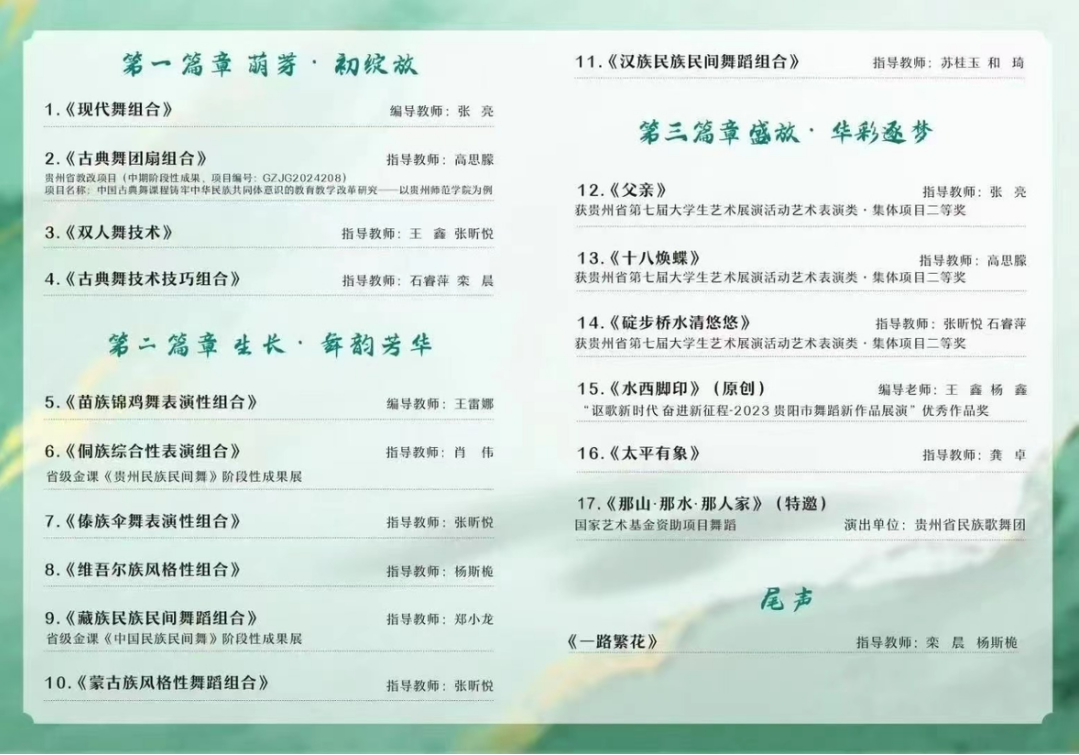 2025 年 4 月 28 日,77779193永利官网集团 2025 届舞蹈专业本科毕业设计汇报演出在北京路大剧院隆重举行。出席本次毕业设计汇报演出的校领导有永利集团党委书记石培新、校长韦维、党委副书记邹晓青、纪委书记韩兵兵、副校长任洁、副校长罗光杰,77779193永利官网集团党委书记李佩、院长马关辉,学校部分行政部门、学院处级干部,原省文化厅副厅长谢彬如,国家一级导演、贵州省舞蹈家协会原主席沈毅,贵州省文化艺术研究院院长曹海玲,贵州省舞蹈家协会主席曾涛,贵州省文化馆副馆长李万红,贵州省教育科学院副院长黄玲,贵州省杂技团副书记、总经理陆水莲等,相关用人单位负责人及学生家长现场观看了演出。