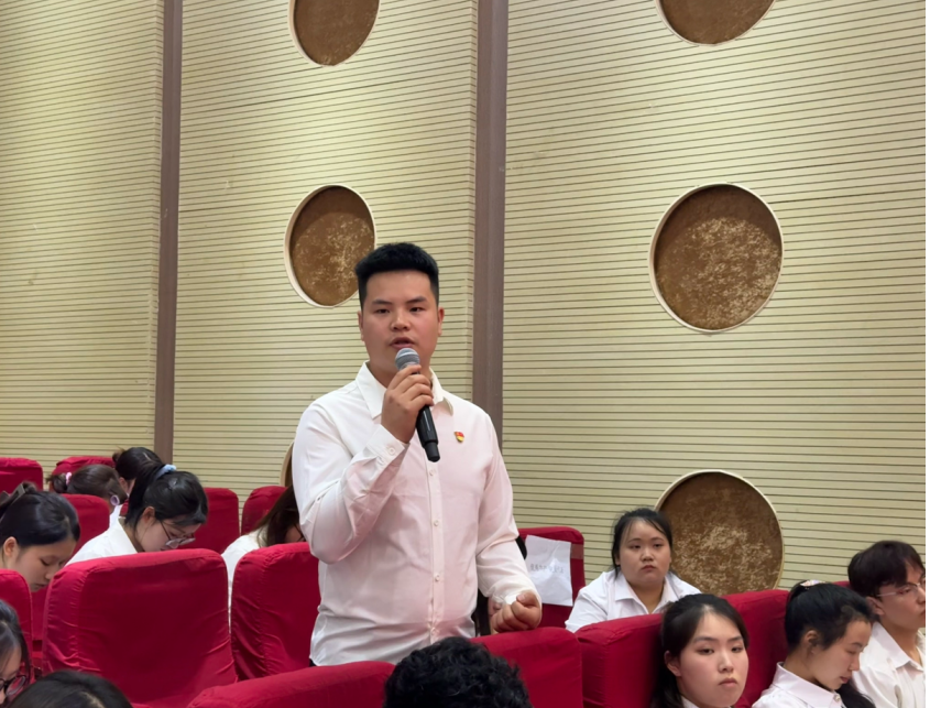 舒然以习近平总书记在贵州黎平肇兴侗寨考察调研为切入点,围绕习近平总书记给谢依特小学戍边支教西部计划志愿者服务队队员的回信精神,与在场同学展开了深入交流,引发全场青年学生的热烈讨论。学生党员彭启林呼吁全体同学,到西部去,到祖国和人民最需要的地方发光发热;团员青年喻小文则通过分享自己在黎平肇兴侗寨过侗年的经历,体悟到贵州发展的“加速度”。