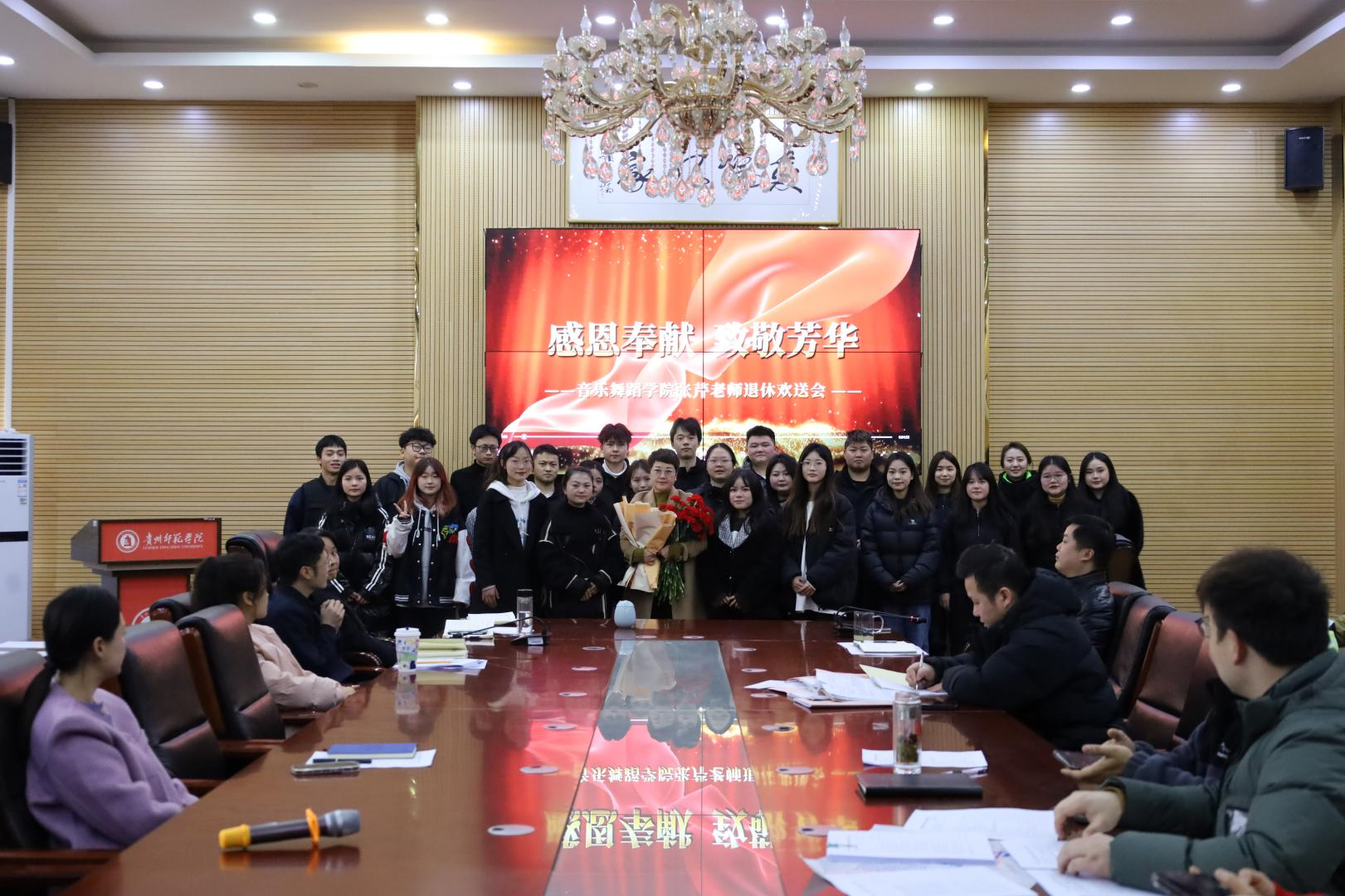 欢送会上,播放了张芹老师从教30余年的历程照片和历届学生对张芹老师的祝福;党委书记李佩代表学院师生为她献花;张芹老师所带的20余名主修生为她献唱歌曲《同一首歌》。整个会场洋溢着浓浓的师生情谊和依依惜别的氛围。