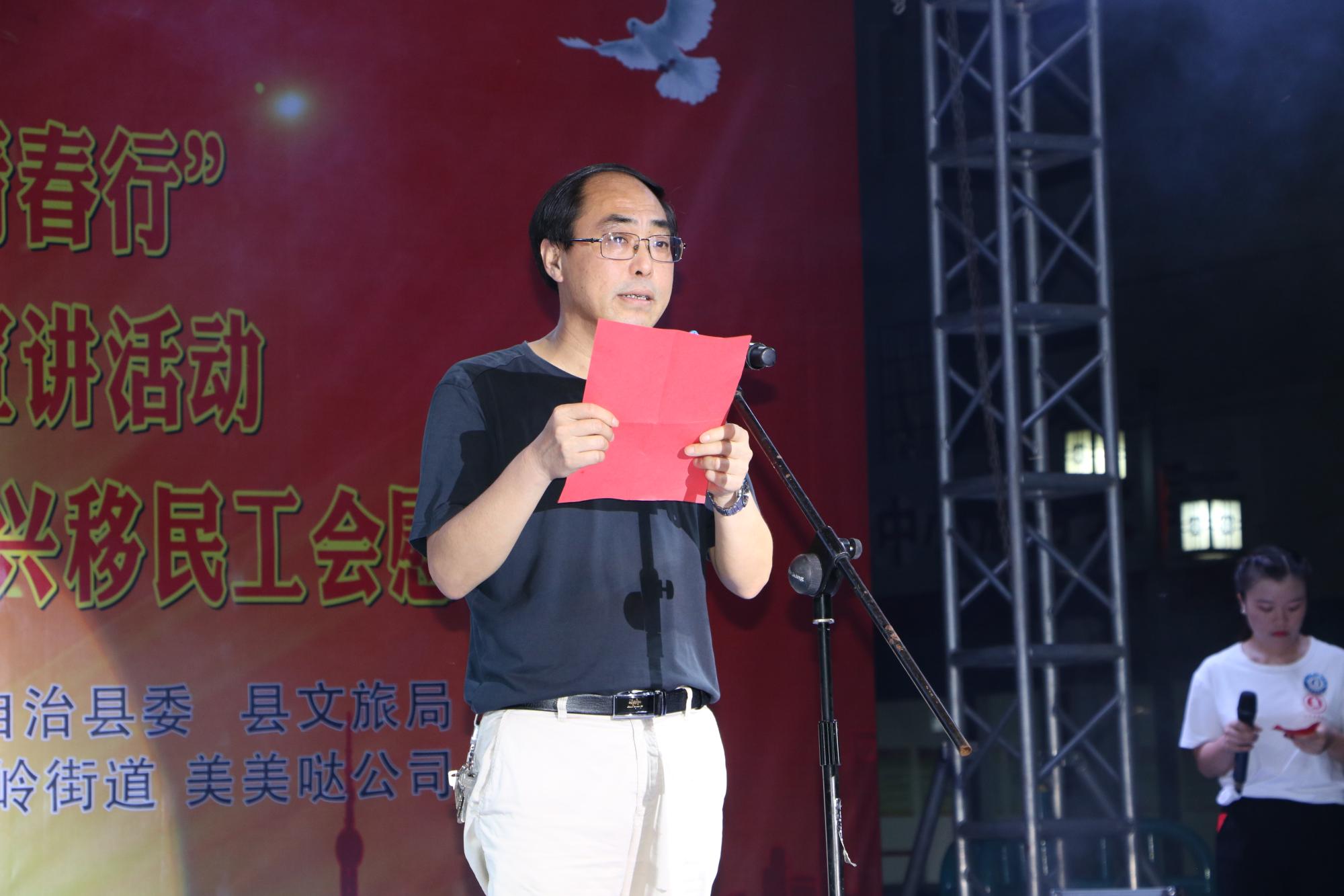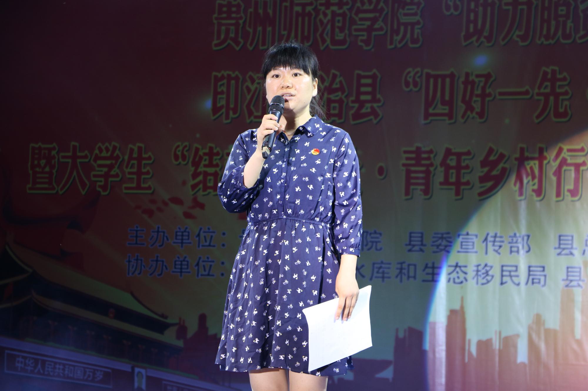 晚上8时,印江自治县“四好一先·五大主题”宣讲活动暨大学生“结对春晖社·青年乡村行”永利集团“助力脱贫攻坚·师院青春行”移民工会慰问演出正式拉开帷幕!演出开始,傅小芳就本次“三下乡”活动做总结报告;接着,夏良强讲话并宣布晚会正式开始。