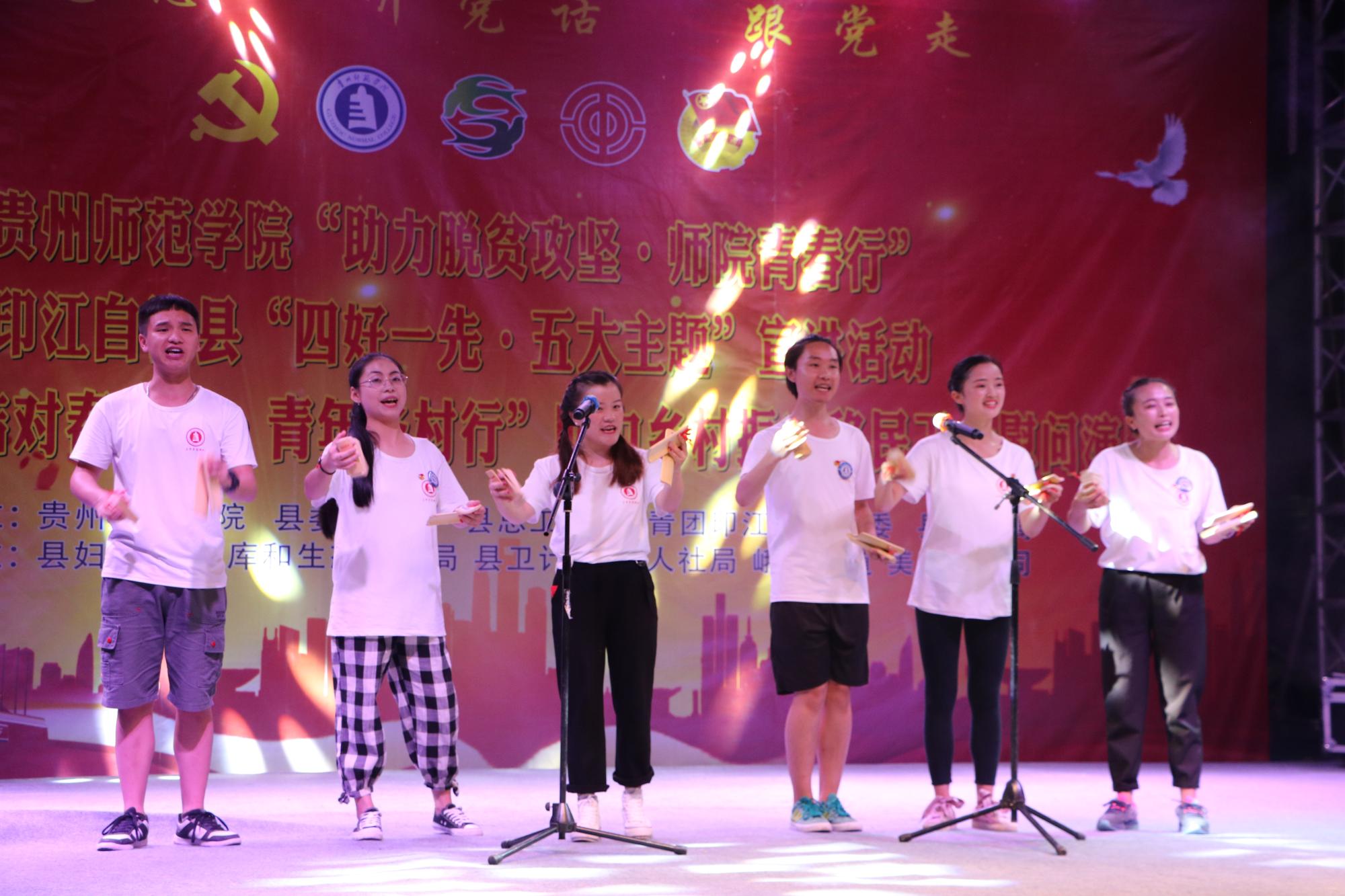 晚会中场,印江县委县政府还为本次活动中表现突出的志愿者颁发奖励;接着,印江县一中老师吴文展的男声独唱《梵净山》、县文工团选送的小合唱《我们的生活充满阳光》、快板《撸起袖子加油干,共建印江新家园》、小品《懒汉扶贫》等节目陆续精彩上演。晚会在音乐系学生蒋兰独唱、全体志愿者伴舞的歌曲《幸福小康》中完美谢幕!永利集团“助力脱贫攻坚·师院青春行”大学生暑期“三下乡”社会实践活动在此圆满落幕!