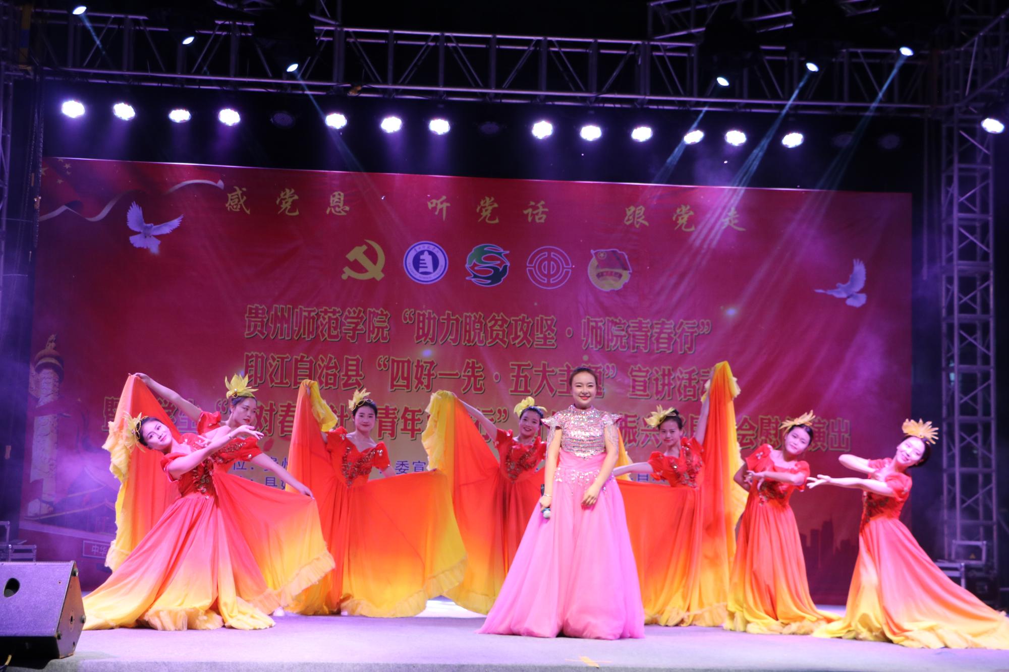一曲曲时下耳熟能详的流行歌曲串烧被同学们改编成为“广场舞”拉开了演出帷幕,艺术学院全体志愿者积极参与演出,他们火热的激情、灿烂的笑容、轻快的舞步,赢得全场百姓的阵阵呼声,小品《扶贫先扶智》引起了晚会的第一波高潮,同学们用方言演绎,表演朴实而接地气,让现场观众时而捧腹大笑、时而暗自流泪;印江县文工团选送的歌伴舞节目《梦回印江》,令人仿佛置身秀丽印江大美风景中,让人陶醉;一首由音乐学专业学生带领普同移民安置区儿童共同演绎的手语歌曲《感恩的心》,无不让在场观众为之动容,孩子们清脆的嗓音、稚嫩的笑脸深深打动着大家;随后,艺术学院舞蹈学专业学生武慧婷、罗鑫瑶、王莲、殷龙带来的舞蹈技巧展示《飞跃新时代,展望新未来》,以高超的炫技动作、矫健的舞姿、精湛的表演,让人叹为观止;音乐学专业学生杨永宏、范耀东、王柳、罗勇海、马夜笛、柏莎同学联袂表演的器乐串烧《吹起脱贫号角,奏响美好生活》,将网络神曲与中西乐器完美结合,让观众们拍手叫绝。