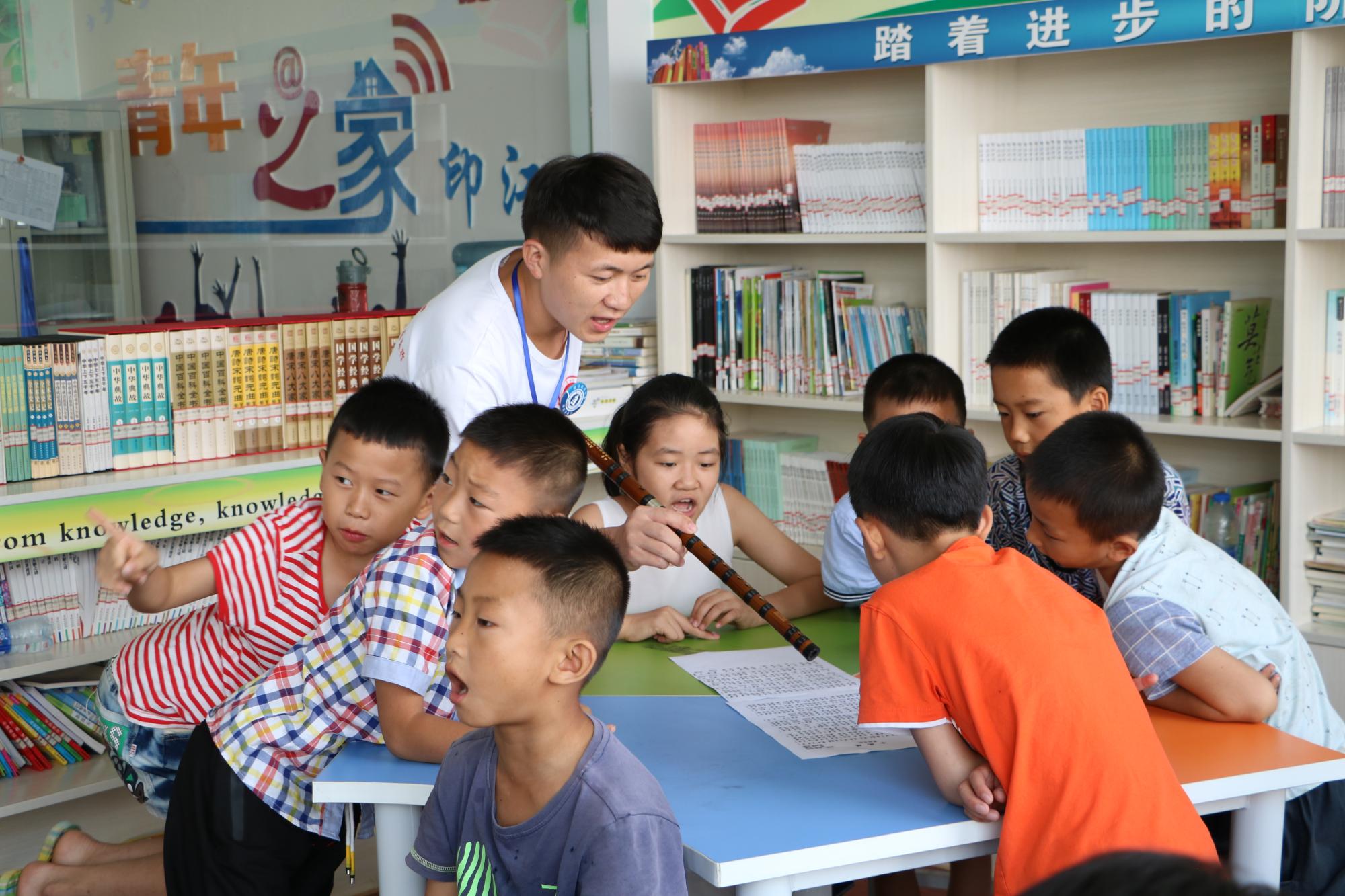 音乐课课程中,范耀东带领孩子们学习歌曲《小跳蛙》;涂仁明复习昨天课堂所教的7个基本音符及简单的节奏型......课堂之余,志愿者们向孩子们分享了自己的成长经历和大学生活。小朋友们好奇的聆听这些“新鲜事”,志愿者们鼓励大家:要好好学习,天天向上,做一个对社会、对国家有用的人。
