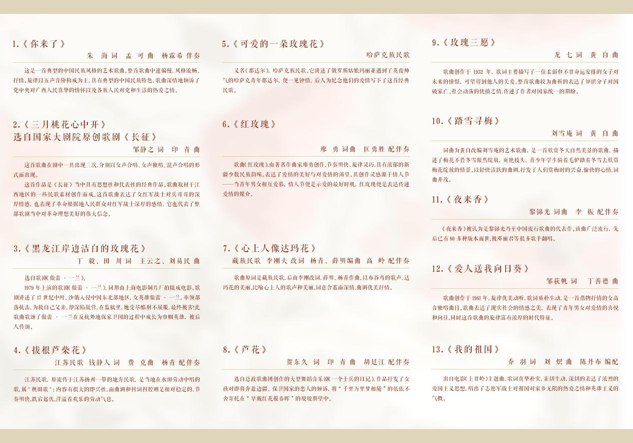 音乐会以“花”为主题,每一首曲目都蕴含了“花”的元素,依次呈现了十三首不同风格和题材的声乐作品。开场由全体女声合唱《你来了》,以优美抒情的旋律倾诉了党中央对人民真挚的情怀以及各族人民对党和生活的热爱之情;紧接着,音符中的花儿们展开了五彩斑斓的音乐画卷:《玫瑰三愿》情景交融,以赞美和感叹的音调,曲折的表达知识分子对国破家亡的忧愤之情;《可爱的一朵玫瑰花》《拔根芦柴花》等不同风格的民歌,展现了祖国各地的民族音乐风情;《黑龙江岸边洁白的玫瑰花》《三月桃花心中开》蕴含着家国大义与民族气节,展现了中华民族深厚的爱国文化传统;《爱人送我向日葵》《心上人像达玛花》等曲目则是以花寄情,唱出了人们对于爱情的美好向往与憧憬;《红玫瑰》《夜来香》《踏雪寻梅》等歌曲轻快活泼、节奏灵巧,将整场音乐会的气氛烘托到高潮。