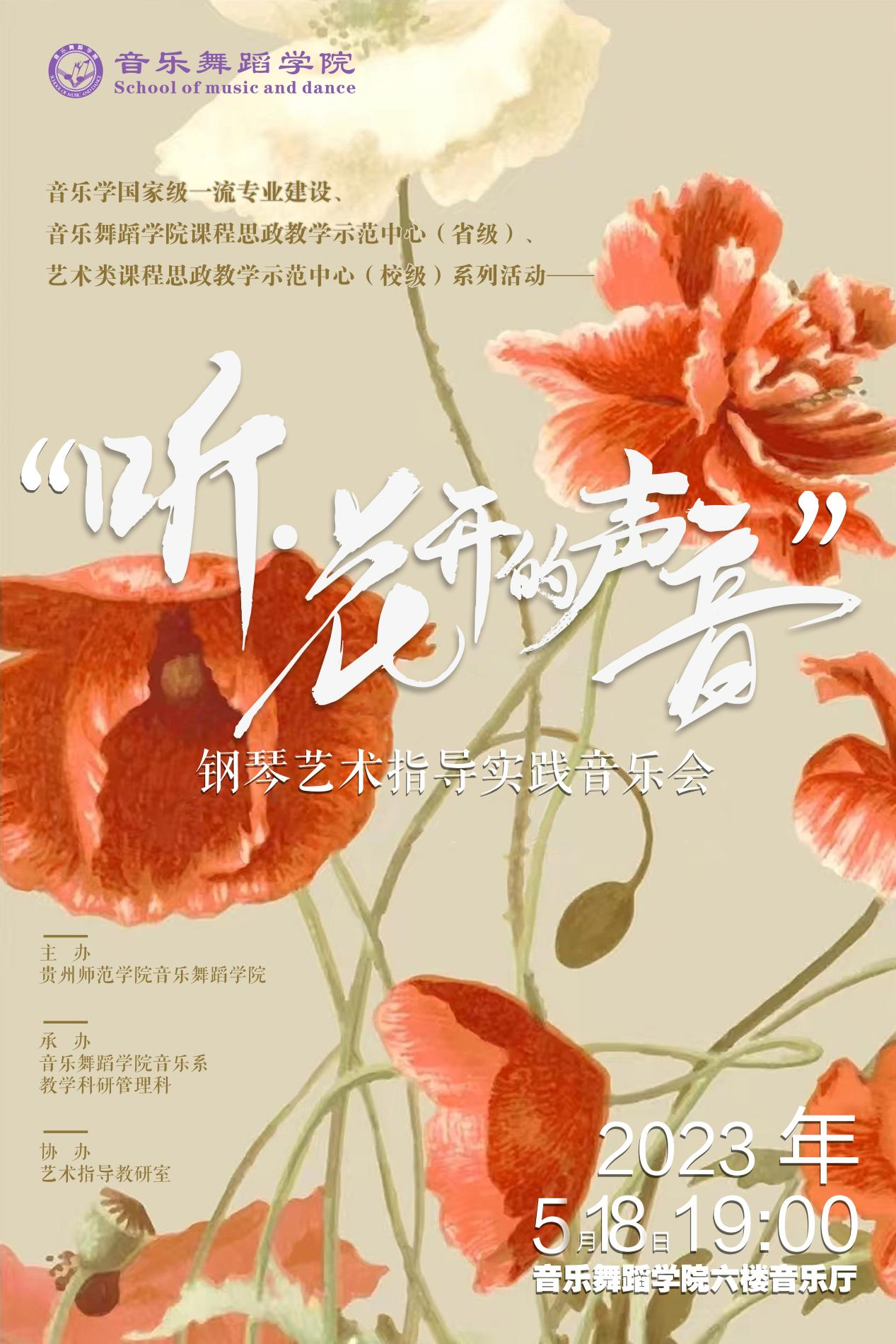 “声”如夏花,“音”你绽放。2023年5月18日晚,“听,花开的声音”——77779193永利官网集团《钢琴艺术指导》课程实践教学音乐会在学院六楼表演厅成功举办。学院领导马关辉、王晓、荆彦超等与老师和同学们一起观看了音乐会。