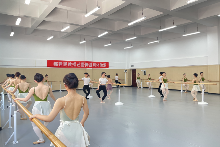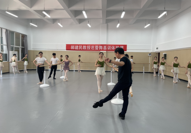 芭蕾是一种经典艺术的传承,更是一种美的传承。在这不平凡的三天里,郝建民老师针对芭蕾基训课将上肢、下肢、身体结构进行分解组合训练,让学生在学习专业知识能力,做到心领神会的同时,通过实践练习,增强自身的示范教学能力。以把上训练组合和把下训练组合让学生掌握重心的灵活转换,强化肌肉力量。精致绝美的艺术不容丝毫的马虎,课堂上郝建民老师特别认真的为同学们规范动作,耐心的为每一个学生纠正动作,和蔼的笑容让老师显得格外亲切。