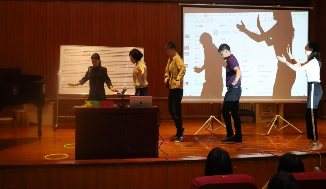 讲座上,罗老师将语言、动作、节奏相结合,同时以A乐剧和B乐剧为例,运用声势活动,如拍手、跺脚、捻指、拍腿等方式让大家感受音乐的节奏、节拍和动律,深刻体验到了奥尔夫音乐教学法的魅力。