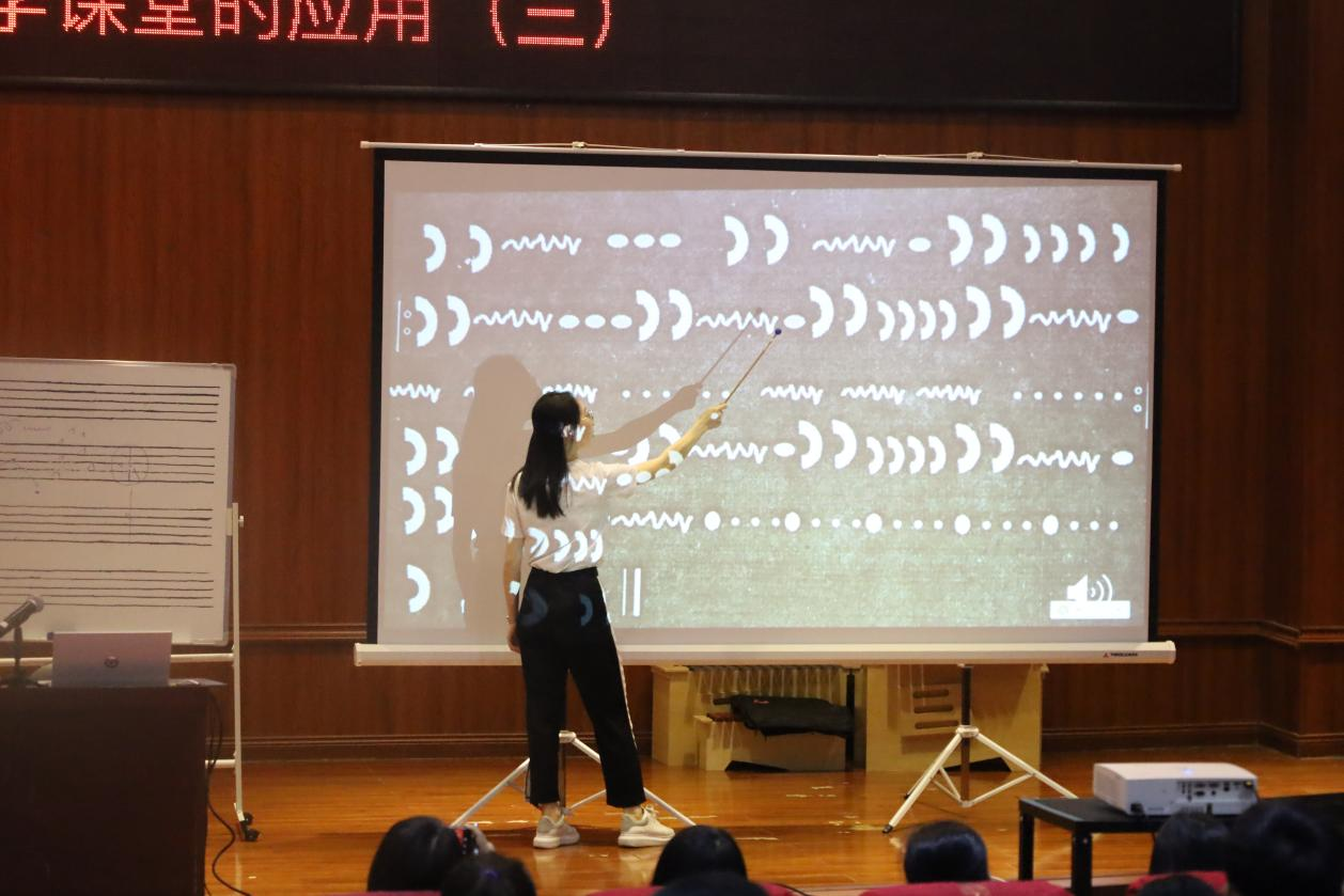 讲座上,罗老师首先通过一年级音乐教学曲目——土家族歌曲《乃哟乃》,讲解如何利用手势配合唱词,以及如何利用道具跳套圈游戏增强师生的互动。接着,罗老师请部分学员上台参与体验,结合土家族的摆手舞进行《乃哟乃》的教学方法。随后,以《小青蛙找家》《糖果仙子舞曲》《进行曲》等歌曲来讲解如何利用响板、气球、纱巾等道具结合音乐图形谱来开展音乐教学。