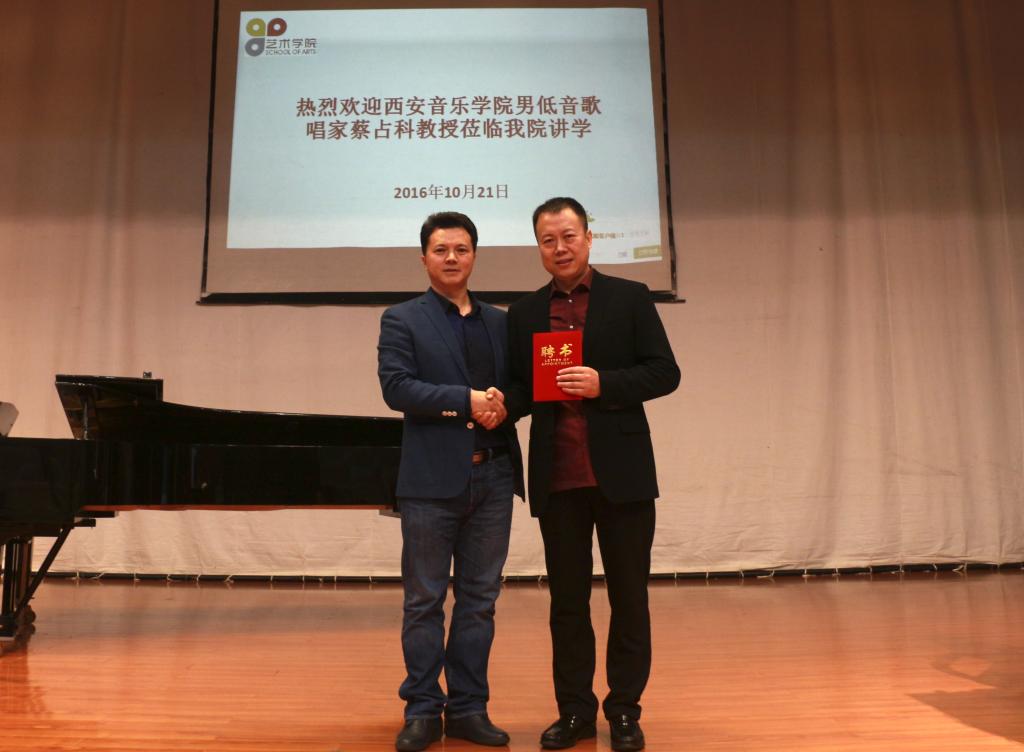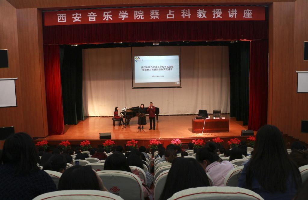作为永利集团艺术学院2016年学术交流周的一部分,10月21日,西安音乐学院教授、硕士研究生导师蔡占科莅临我校讲学。上午9:00,逸夫楼演播厅座无虚席,共同期待蔡占科教授的《声乐演唱及公开课》讲座。艺术学院党委书记付巧、院长马关辉参加讲座。讲座由马关辉主持。