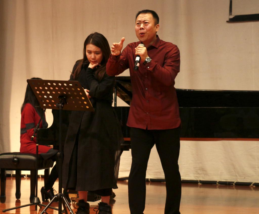 蔡占科教授对元音的重要性作了科学探讨,他指出,解决元音音区问题就需要把纯正的中英文放入口中。讲座还涉及到演唱时嘴型及面部肌肉对发声影响的科学原理。蔡占科教授还邀请学生上台演示声乐歌唱,并进行一一进行点评。