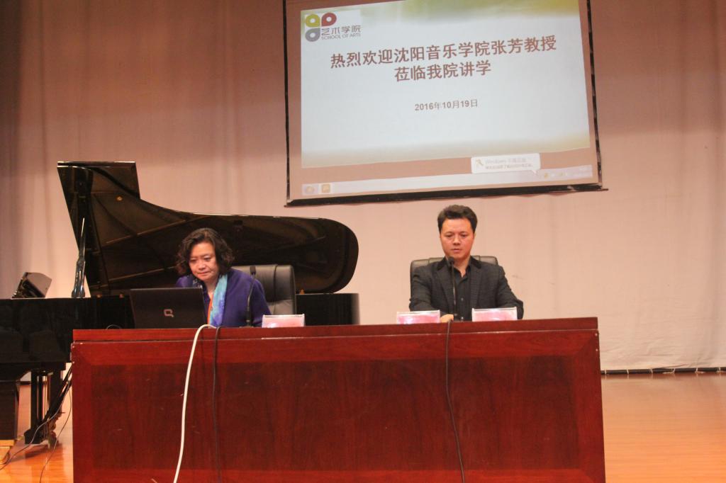 10月19日,沈阳音乐学院张芳教授来我校展开学术交流讲座。艺术学院党委书记付巧、院长马关辉及音乐系教师和同学参加了活动。讲座由艺术学院院长马关辉主持。