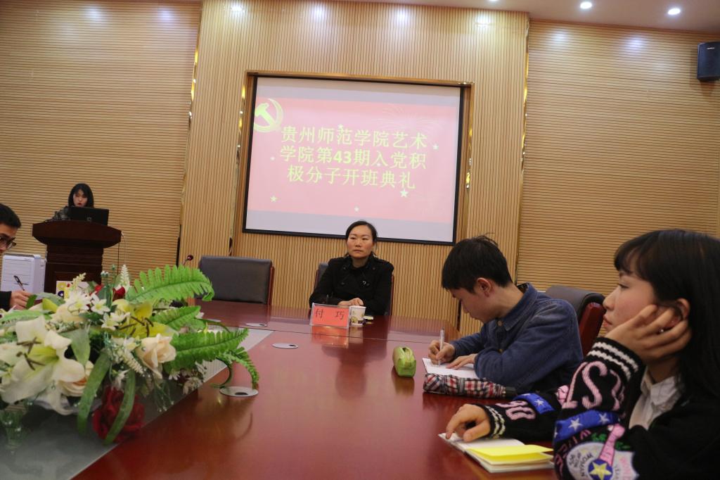 4月12日中午,艺术学院第43期入党积极分子培训开班典礼在学院会议室隆重举行。艺术学院党委书记付巧出席了本次会议,典礼由学生党支部副书记柏莎主持。