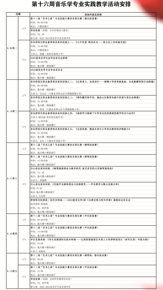 本次实践教学周以“专业技能+职业素养+劳动教育”为三大支柱,通过“赛事观摩+讲座学习+舞台实践+劳动体验”的多元形式,构建了立体化实践教学体系。从器乐、钢琴、声乐等专业赛事的层层选拔,到中小学教育实践、艺术教学理论等多维度讲座,再到课程结业音乐会的成果展示与劳动实践的全程融入,全方位覆盖了音乐学专业学生的成长需求。