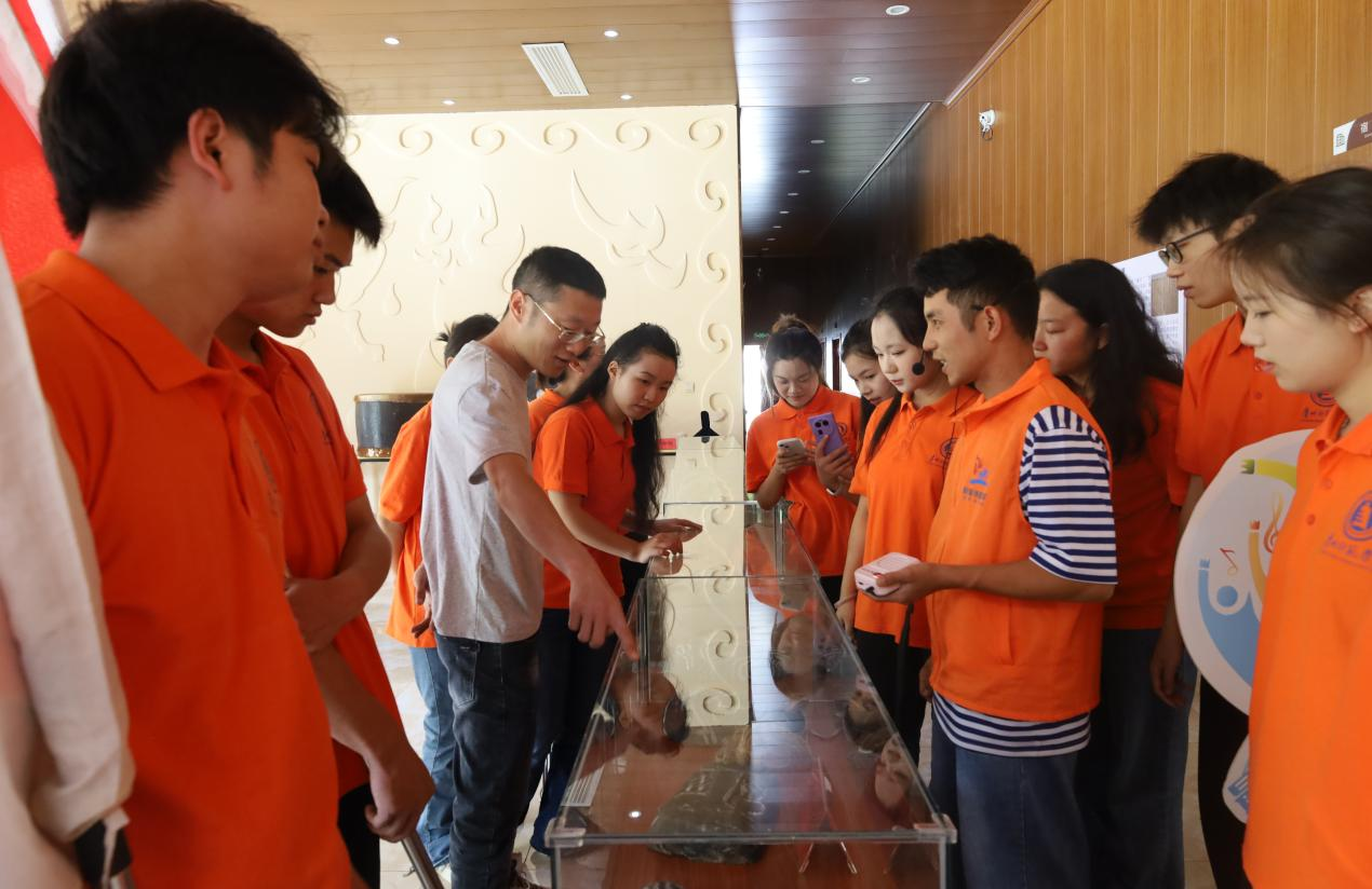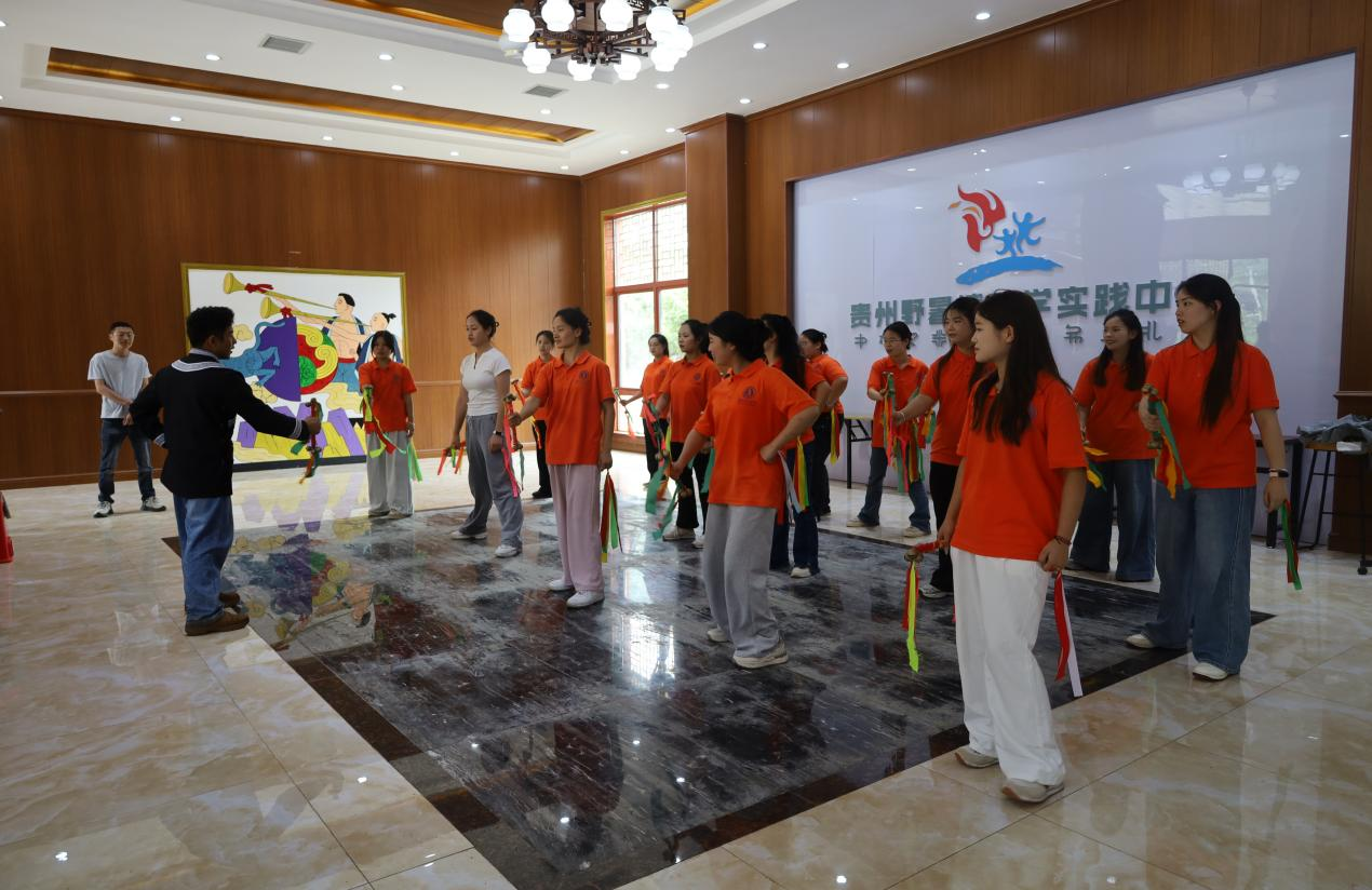 午后,团队来到贵州野暑博研学基地,开启了一场深度的彝族文化寻根与互学互鉴之旅。在基地讲解员杨玺老师的带领下,师生们参观了六盘水当地历史文化博物馆,系统梳理了地域文脉,深刻感受到中华民族多元一体格局下地域文化的独特魅力。随后,师生们沉浸式的体检了彝族非遗文化。师生们亲手触摸并尝试演奏了彝族月琴,深入了解了铜铃、口弦、葫芦笙等传统乐器在彝族同胞生活中的地位及其在中华乐器宝库中的独特价值,并通过近距离观察双兜兜、牛皮鼓、撮泰吉牛头、毕摩帽等丰富多样的彝族文化符号,对彝族的生产生活方式、节庆礼仪等有了更为具象和深刻的认识,增进了对中华文化多样性、丰富性的理解与尊重。在杨玺老师的带领下,团队成员还学习了彝族传统舞蹈——铃铛舞,重点体会了“凤凰穿林”、“拨开云雾见青天”等极具象征意义的肢体动作,领悟舞蹈中蕴含的自然崇拜、生命哲学及其所代表的中华民族共通的精神追求。最后,团队成员体验了苦荞饼的制作流程,从原料到成品,体验彝族饮食文化的智慧与朴素之美,传承忆苦思甜的优秀作风。