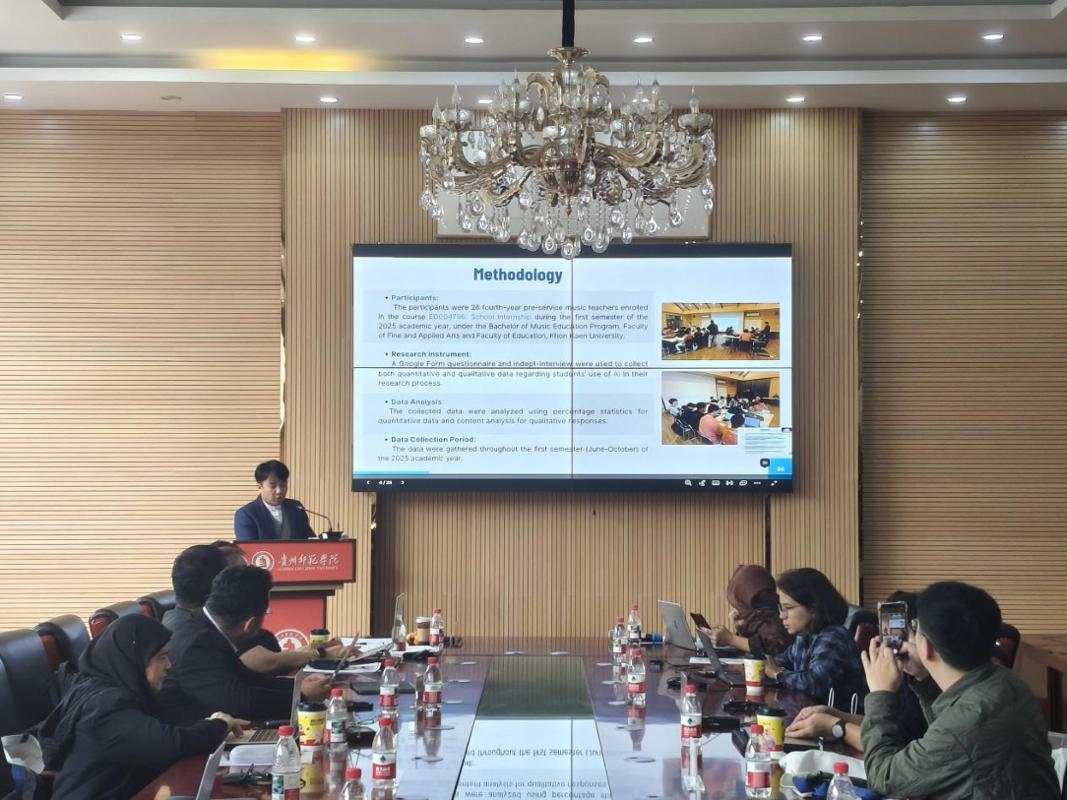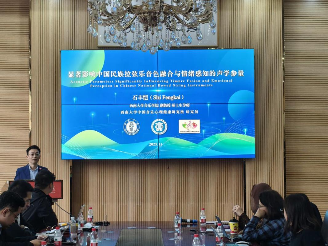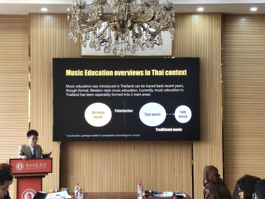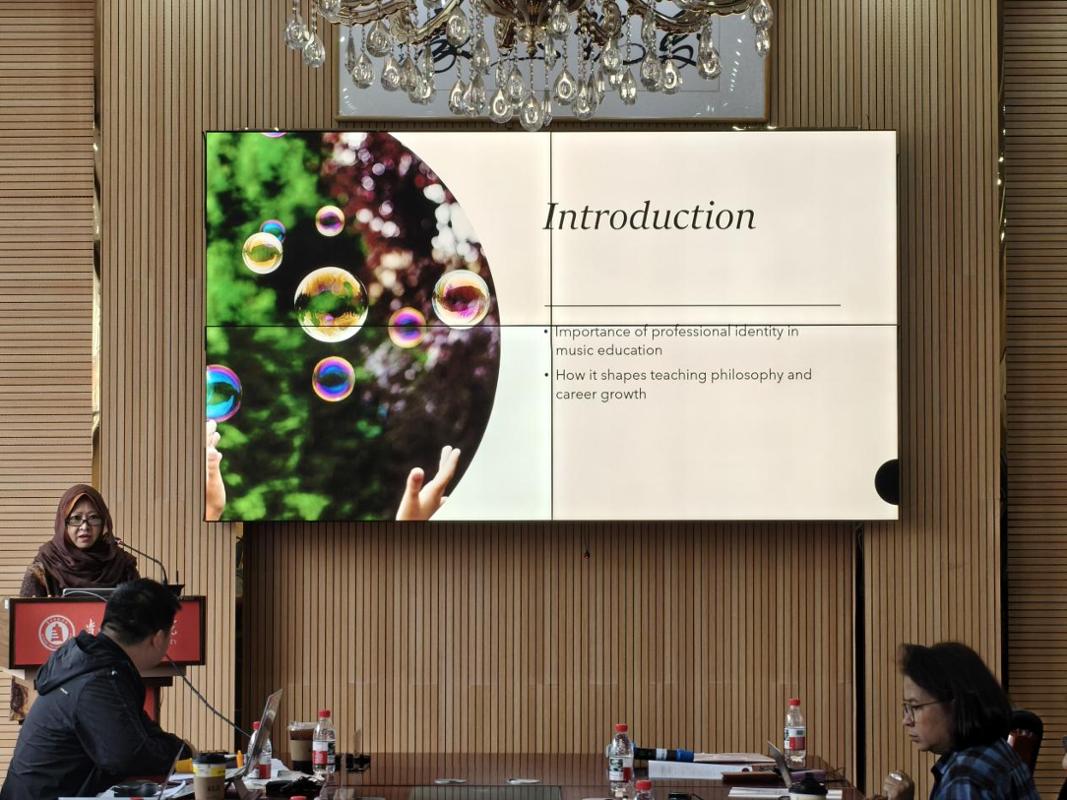 下午的研讨进一步拓展至细分领域:马来西亚理科大学学者探讨了AI音乐平台的技术偏见对全球教育的影响;泰国学者从高教转型、教师身份构建等维度分享科技融合心得;中国学者团队亮点频出——百色学院崔保亚以短视频非遗内容解析跨媒介叙事,西南大学石丰恺聚焦民族拉弦乐音色融合,南洋理工大学王峻煌探索了混合式学习在普通音乐课堂的应用路径。