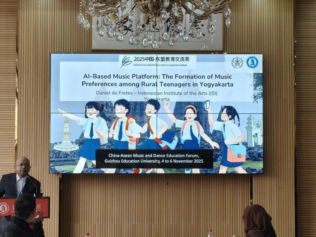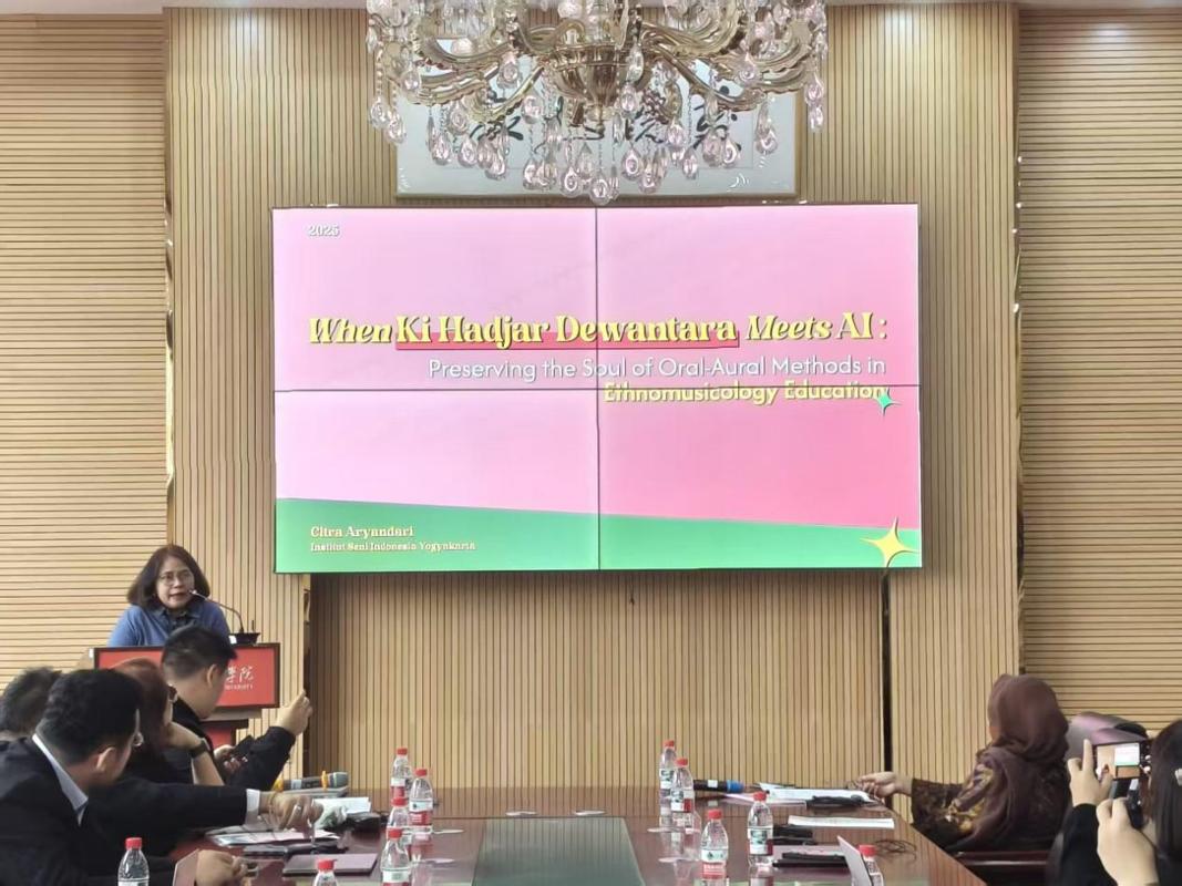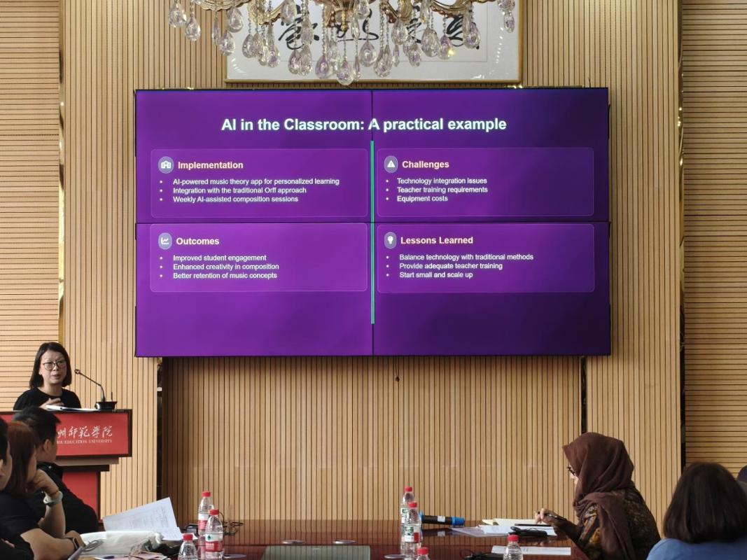当日上午10时起,各国学者围绕AI与音乐教育的本土实践展开研讨:印尼日惹艺术学院学者聚焦本土文化与技术融合,分享AI对青少年音乐偏好的影响;马来西亚苏丹伊德里斯教育大学专家介绍了该国音乐教育智能化转型的实践经验;泰国学者剖析了传统音乐教育中AI应用的挑战与职前教师培养的AI趋势;中国学者则立足本土,重庆师范大学周晓彬重构了AI数字技术下的多元感官音乐体系,阿坝师范学院李文分享了AI辅助表演训练的实践方案。