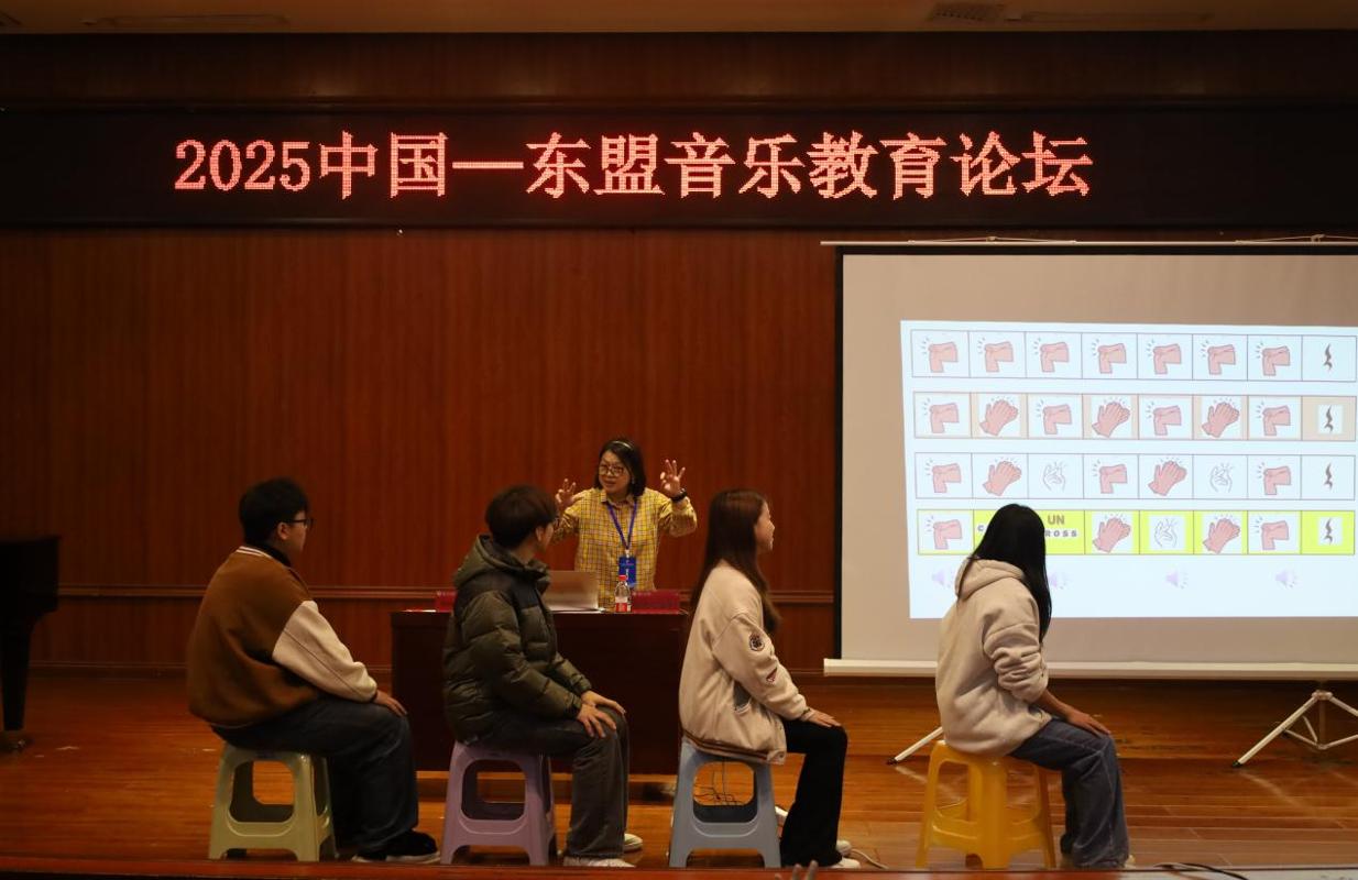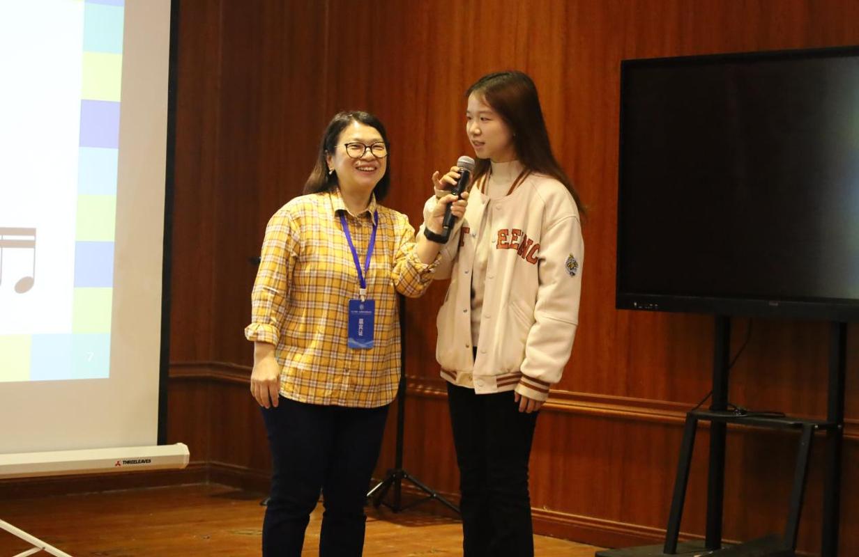为让每位同学都深度参与,黄慧怡博士多次走下讲台与学生互动,通过节奏问答、即兴模仿、小组协作等形式引导大家主动探索。同学们在她的带领下,用名字音节编排打击乐片段,以肢体动作呼应旋律起伏,在游戏化的氛围中完成了从“听众”到“参与者”的转变,真切体会到奥尔夫教学法“弱化技巧、强调整体艺术体验”的精髓 。现场时而响起整齐划一的节奏律动,时而迸发创意十足的即兴表演,充分展现了音乐教育的包容性与趣味性。