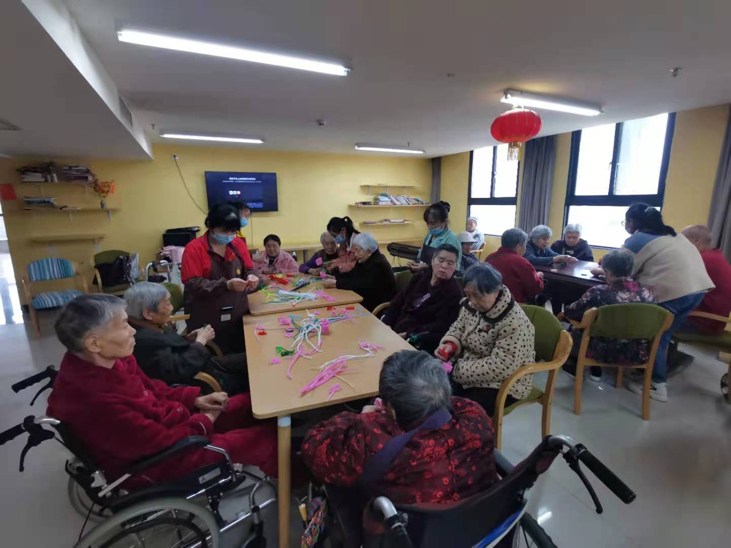 4月11日下午,今日教学如期举行,所授内容为手工制作,本次课程由教育科学学院的同学进行授课。2018级学前教育一班的谭荧,彭益赛,张荣誉三人对于本次的志愿活动都较为期待,在课前做了充足的准备并筹备本次课程所用的材料。本次课程的学习主要以制作手工花为主。在三位同学的细心教学下,老人们积极投入到手工制作中。活动结束后,老人们对花朵进行了保存,并和三位同学进行合影留恋。