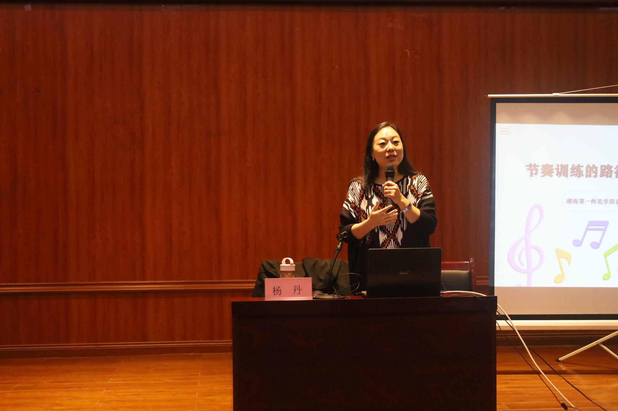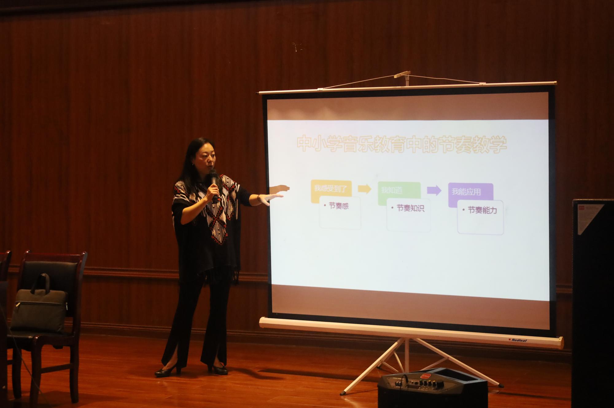 首先,杨丹教授给大家讲解了音乐的灵活性,音乐教育者要秉承音乐与生活相结合的理念从而把音乐更好的传递下去。节奏与生活息息相关。教师一方面可以通过游戏等活动来进行节奏训练;另一方面可以为学生提供一些生活中常见的打击乐器来感受节奏性。其次,运用语言教学法也能让学生们更好的提高节奏感,教师要运用语言中的节奏攻克音乐学习中的节奏难点。接着,杨丹教授对节奏提出几个相关问题:在节奏教学中有什么困惑?在你的节奏教学中常用的方法?杨丹老师以实践性的方法让学员们上台自行感受从而解决困惑,让学员们更深刻的体会到节奏与生活的一体性。