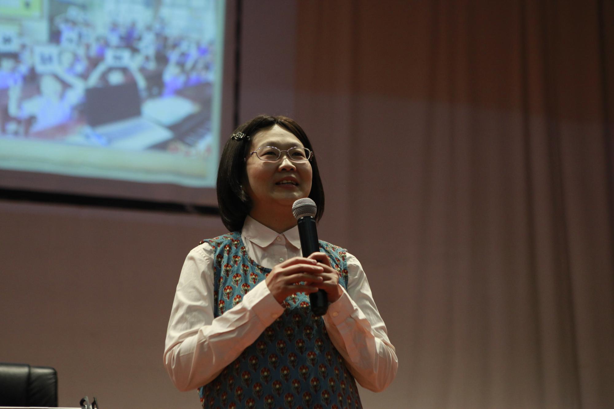 陈虹百教授从怎样培养小学生的音乐兴趣、交往能力等开始讲座,用幽默、生动、风趣的语言给大家讲解课堂教学中现实案例,并与现场师生互动。
