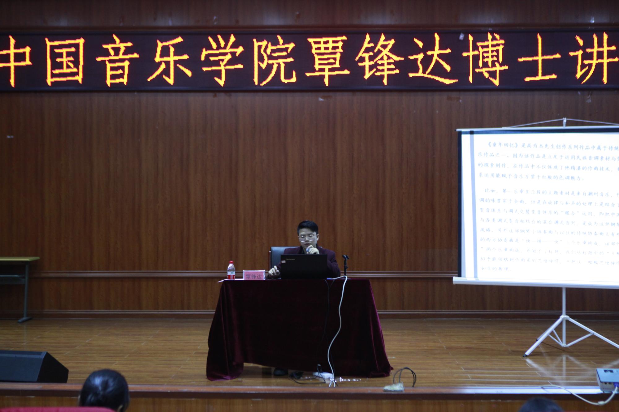 在讲座中,覃锋达博士以高为杰先生创作的钢琴小协奏曲《童年回忆》为例,对民族音调素材与变音体系技法相结合的作曲手法进行了深入的探讨。在讲座中,覃博士分析、讲解了这部作品第一乐章《乡愁》和第二乐章《童趣》的主题特征、调式特征、变音体系技法等,在讲解的过程中分享了自己的音乐创作理念和方法。
