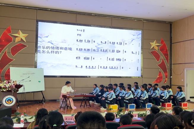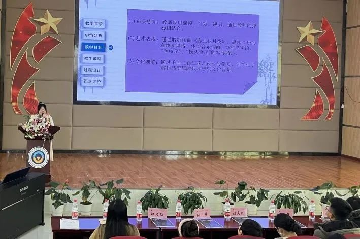 在教学展示环节,首先由音乐学专业实习生赵美辉执教人音版第三单元“八音之乐”的古典民乐《春江花月夜》。她带领高一(1)班同学们进行40分钟精彩的现场教学展示,旨在通过本课对传统音乐创作手法的探索,弘扬民族文化,树立家国情怀。音乐学专业实习生杨繁则运用实习期间教研所得,基于省实验中学“三立六有”教学评价范式,从教学背景、学情分析、教学目标、过程设计、教学策略、课堂评价六个维度进行了10分钟的教学阐释。
