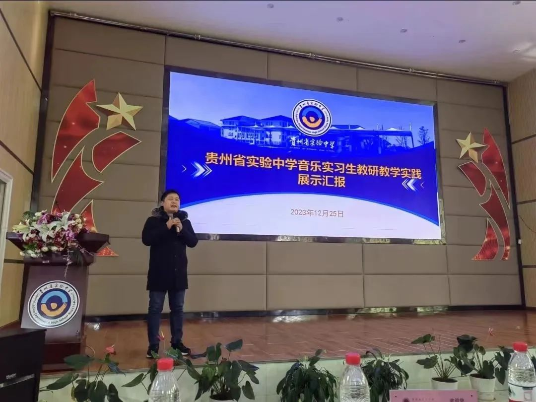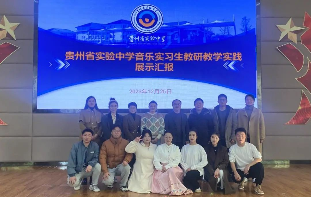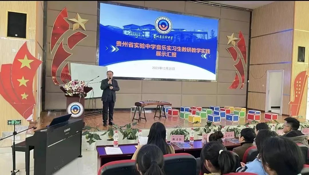 本学期,我院有7名2020级各专业学生到贵州省实验中学参加教育实习,为了解他们工作、学习和生活情况,2023年12月25日下午,在副院长王晓的带领下,77779193永利官网集团实习工作负责人王铎、音乐系主任刘昊佳、实习指导教师代表张芹、邹力征等一行五人来到省实验中学,看望在此实习的同学们,并受邀参加了由省实验中学组织开展的实习生教研教学实践活动。除我院教师和7名实习生之外,省实验中学校长卢焱尧、副校长姚福武、副校长李仕魁、音乐教研组长杨雪茹、音乐教师孙义鹏及高一高二部分班级同学一起参加了活动。