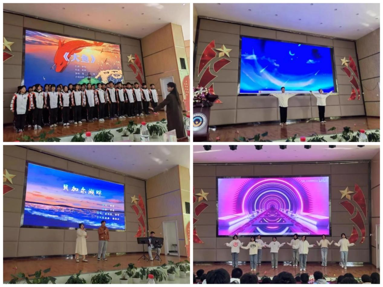 在实践展示环节,我院实习生和实验中学的同学们同台演出,展示了我院各专业实习生扎实的歌唱、舞蹈、器乐演奏、合唱指挥、舞蹈编排等专业基本功。实践展示的最后一个节目,是由实验中学音乐教研组长杨雪茹老师指挥、高一达观合唱团四十多名学生演唱的三声部混声合唱《最好的未来》,歌声优美动听,各声部均衡协调,充分展示了实验中学学子优良的艺术素质。