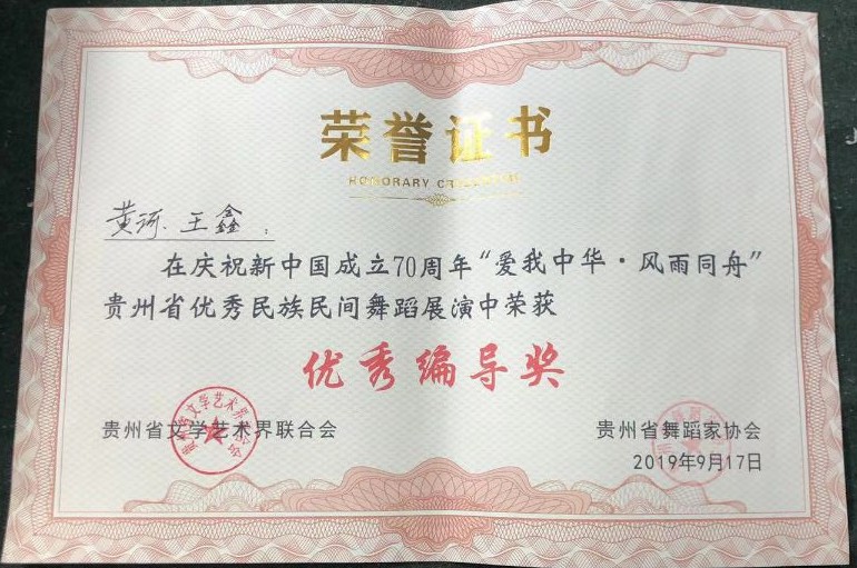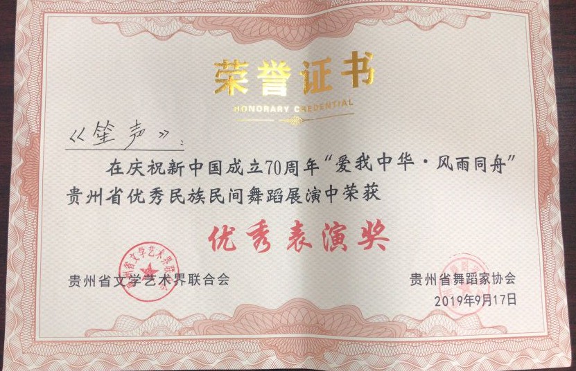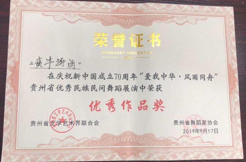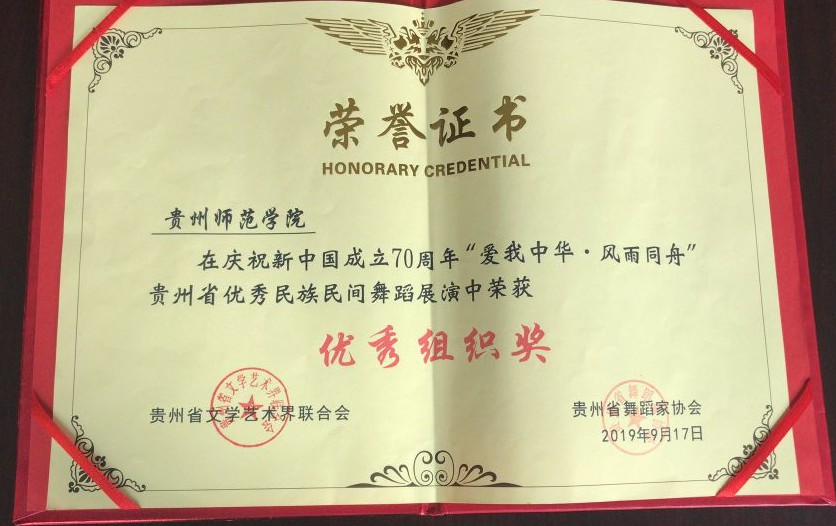 2019年9月,77779193永利官网集团参加由贵州省文学艺术界联合会、贵州省舞蹈家协会主办的庆祝新中国成立70周年“爱我中华.风雨同舟”贵州省优秀民族民间舞蹈展演。本次展演旨在庆祝新中国成立七十周年,弘扬中华民族文化,展现贵州各族人民在中国共产党的领导下,感恩奋进、砥砺前行,爱祖国、爱家乡的良好精神风貌。展演为激励本土创作人员,发现和培养优秀表演人才,共设置6个优秀作品奖、6个优秀编导奖以及10优秀表演奖,表现形式为单人舞、双人舞、三人舞和群舞。