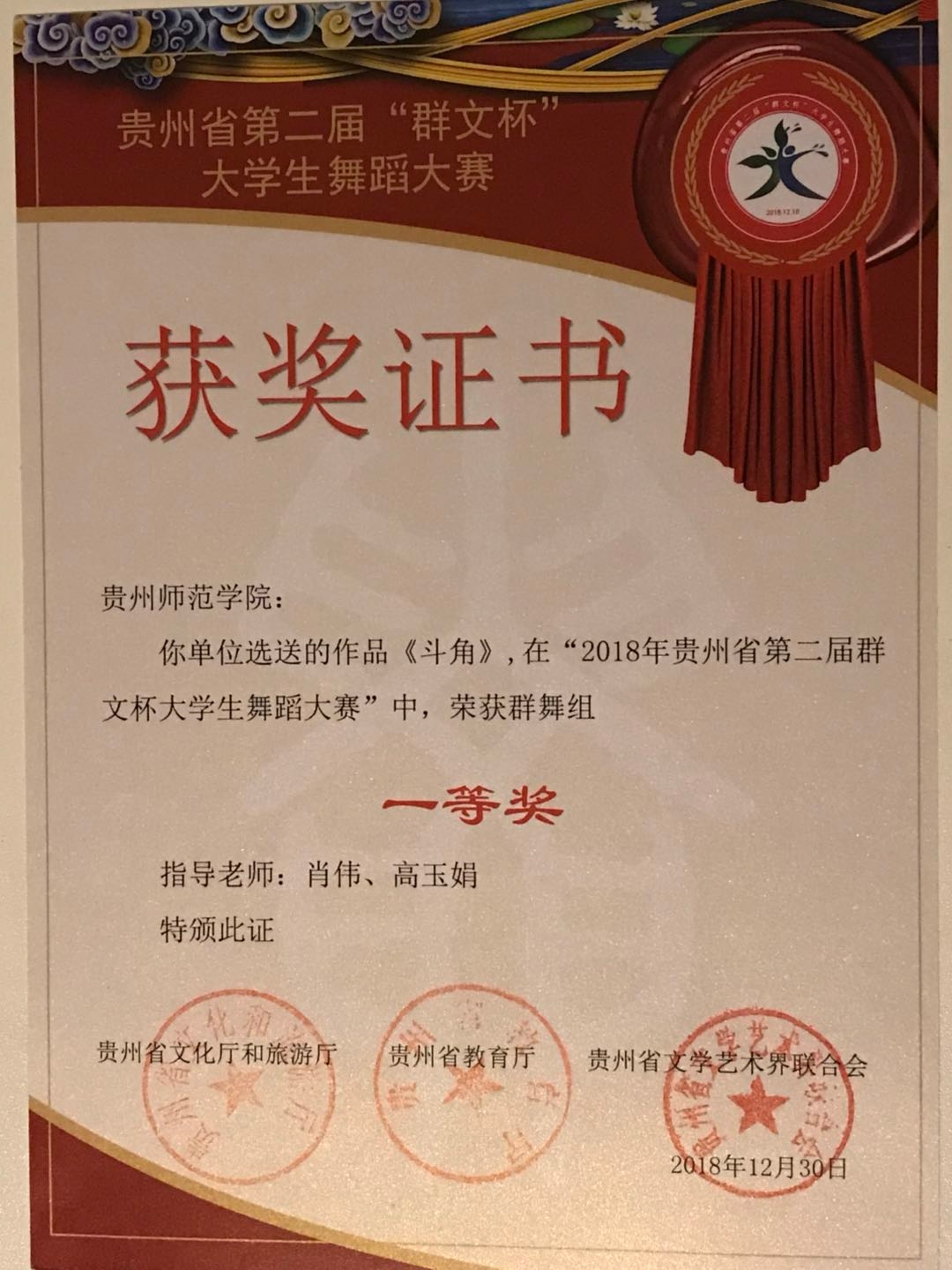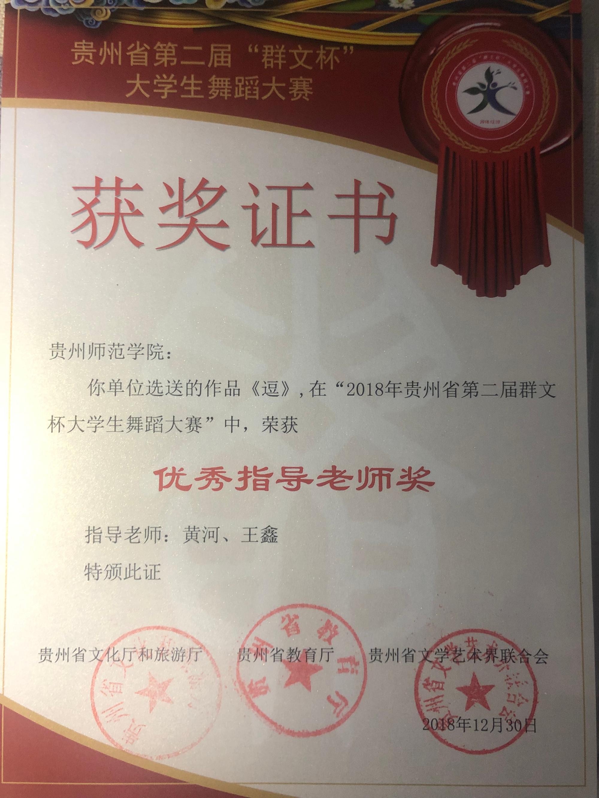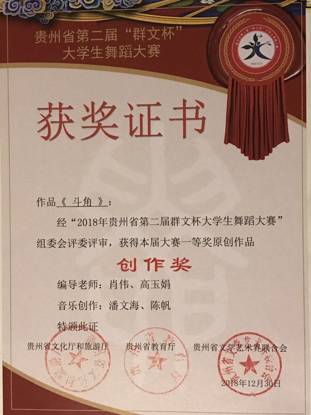 该活动自2018年12月启动以来,来自贵州省36所高校的4000余人积极参赛,初赛从各市(州)选拔出154个节目进入复赛,经过组织专家组观摩和评议,最终评选出群舞、单、双、三人组舞蹈共23个节目进入决赛。我院选送的作品《斗角》、《刘胡兰》、《逗》、《青丝红颜》均在此次比赛中获得优异成绩。作品《斗角》荣获群舞组“一等奖”和原创作品“创作奖”;作品《刘胡兰》在此次比赛中荣获单、双、三人舞组“二等奖”;作品《逗》在此次比赛中荣获单、双、三人舞组“三等奖”;作品《青丝红颜》在此次比赛中荣获“优秀作品奖”。四个作品的指导老师均荣获“优秀指导老师奖”。