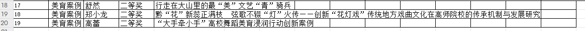 此外,在贵州省第七届大学生艺术展演活动中,我院舒然、郑小龙、高蕾三位老师荣获美育案例二等奖;在学生集体展演活动中,我院学生分别荣获三个一等奖和四个二等奖;在学生个人展演活动中,我院学生分别荣获四个一等奖,两个二等奖和一个三等奖。