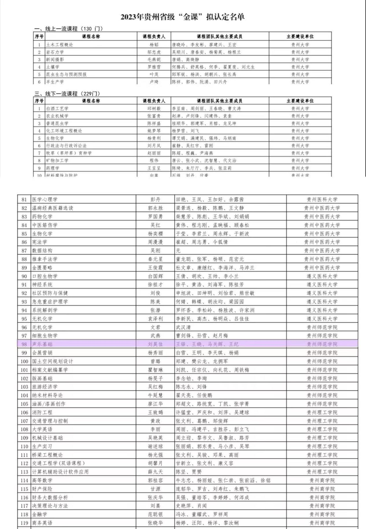 在近日公布的《贵州省教育厅关于2023年省级“金课”认定结果的公示》中,我院刘昊佳老师的《声乐基础》以及肖伟老师的《贵州民族民间舞》两门课程获得省级“金课”认定。