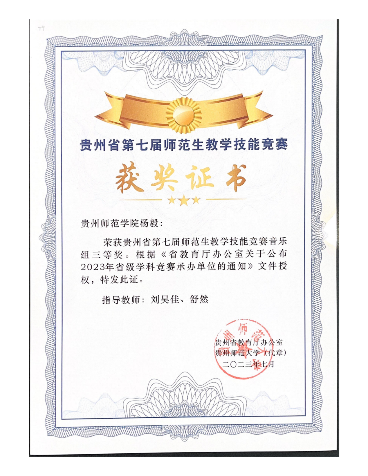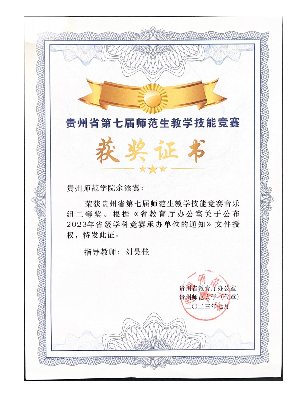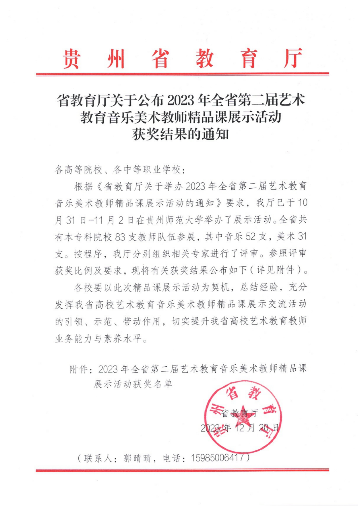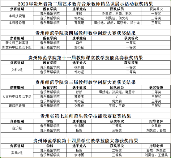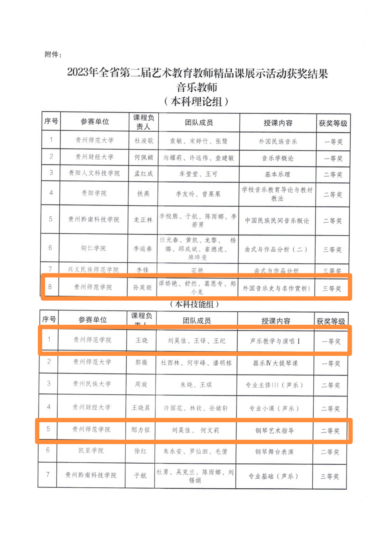 王晓、邹力征两位老师分别获得2023年贵州省第二届艺术教育音乐教师精品课展示活动本科技能组一等奖和二等奖;孙芙炬老师获得2023年贵州省第二届艺术教育音乐教师精品课展示活动本科理论组三等奖;永利集团获得优秀组织奖。