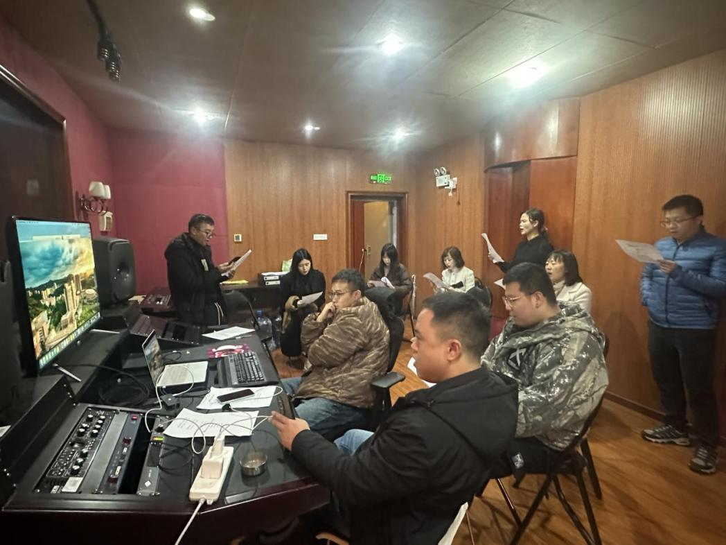 理论教研室自接到通知以来,组织老师展开研讨,积极筹备,商议演出方案,并于2023年12月5日-7日期间,组织何帮助学校各公共课教研室教师代表分别走进录音实训室进行歌曲录制工作。期间,我院理论教研室也借此机会与来自不同学院、不同专业的老师们就专业建设、学科发展、教学改革、课程创新等问题进行了交流、研讨、学习与互鉴,达到了良好的教研效果。