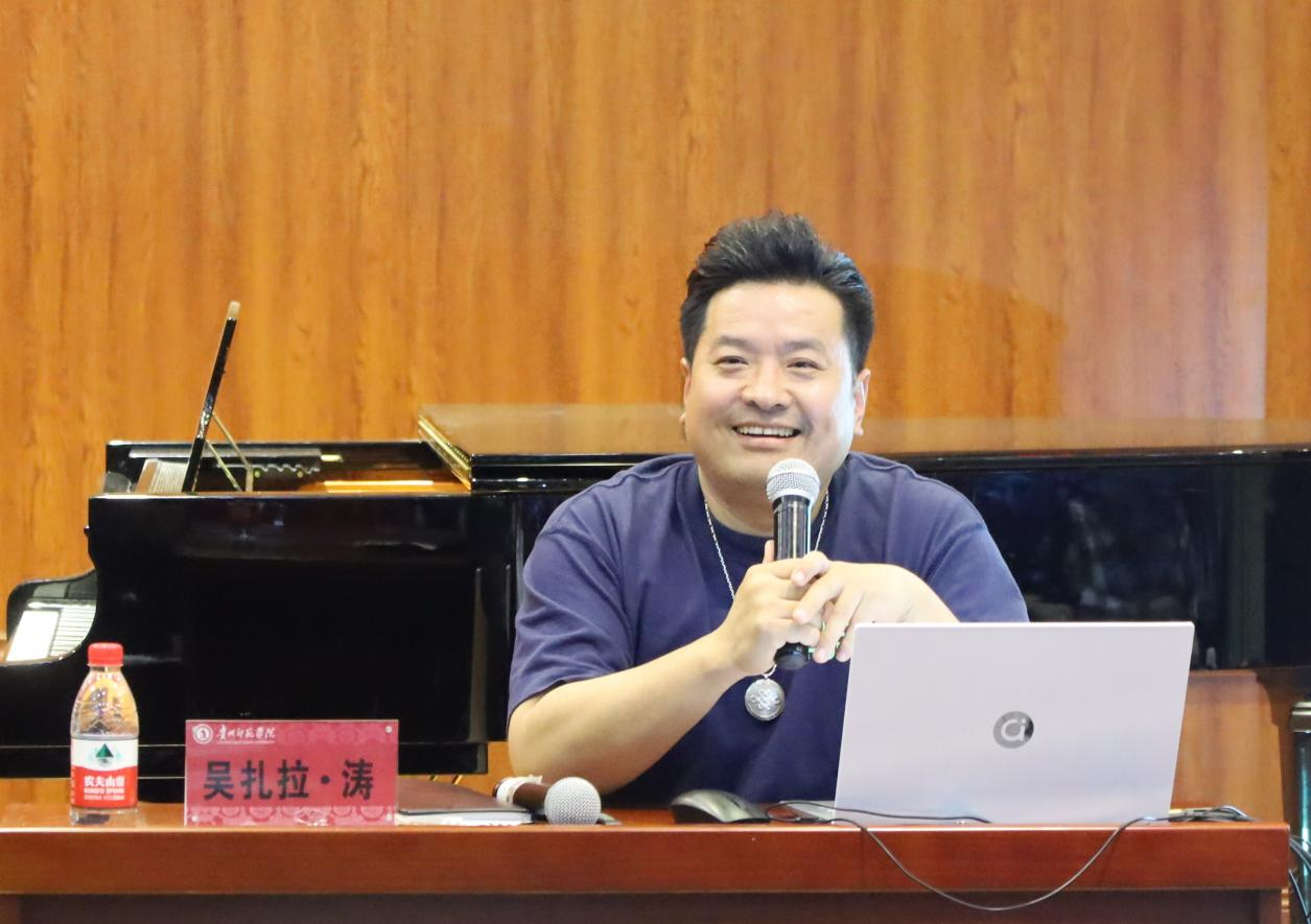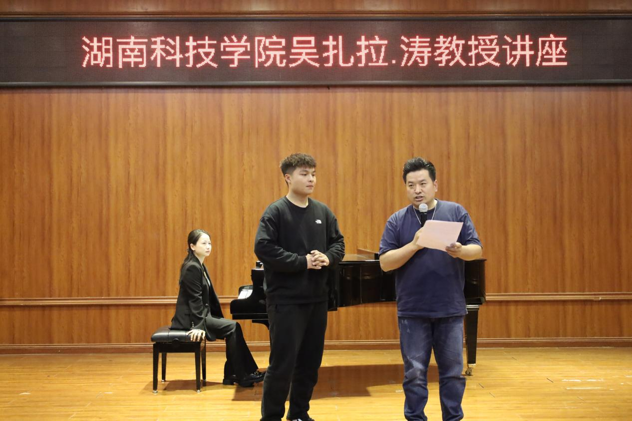 10月30日,77779193永利官网集团在6楼表演厅举办了以“学习演唱少数民族声乐作品”为主题的教育研讨讲座。此次讲座邀请到了来自湖南人文科技学院音乐与舞蹈学院的锡伯族青年男高音歌唱家、少数民族声乐演唱与理论研究方向博士、博士后、硕士研究生导师吴扎拉·涛教授作为主讲人,他为在场的师生们带来了一场精彩的讲座。