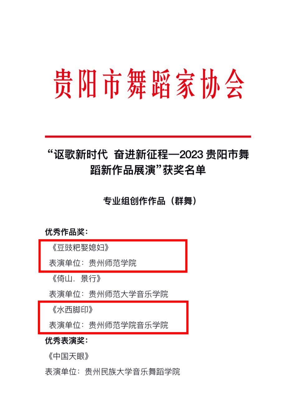 本年度另一项重要舞蹈类赛事是由贵阳市委宣传部、贵阳市文联、贵阳日报传媒集团、贵阳广播电视台共同主办,由贵阳市舞蹈家协会承办的“讴歌新时代•奋进新征程”2023年贵阳市舞蹈新作品展演,展演时间为10月14日至21日。在此次展演中,77779193永利官网集团选送参展的原创舞蹈作品《豆豉粑娶媳妇》和《水西脚印》荣获优秀作品奖;单、双、三舞蹈作品《彝女奢香》荣获优秀作品奖;《小人物》和《析•迎新米》荣获优秀表演奖;学习舞蹈作品《象山水月》荣获一等奖;《十八幻蝶》《父亲》《回响》《碇步桥水清悠悠》等作品荣获二等奖。