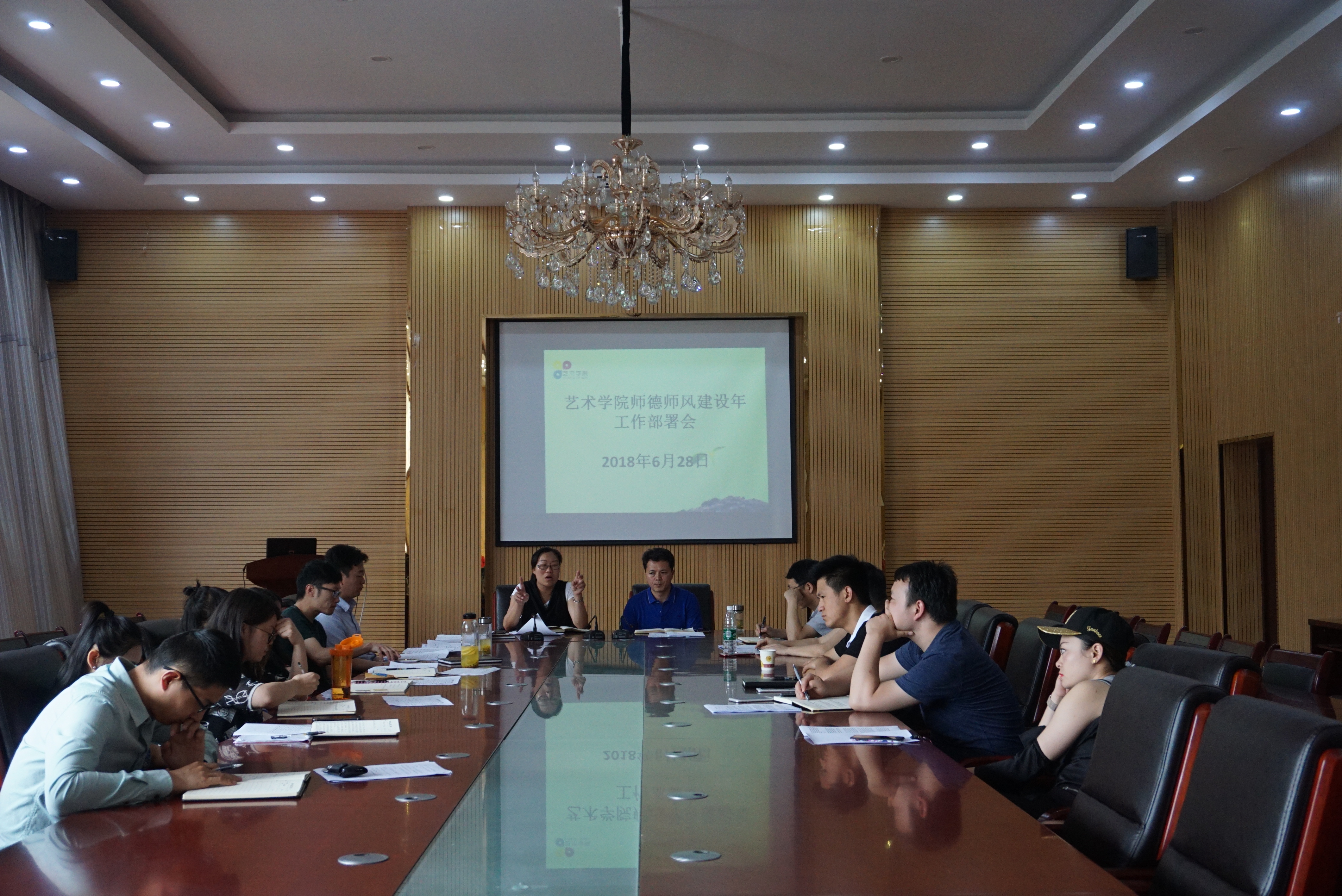 为进一步加强教师队伍建设,巩固师德师风建设成果,树立艺术学院良好形象,6月28日,艺术学院在6楼会议室召开师德师风建设年工作部署会,艺术学院党委书记付巧、院长马关辉、党委副书记朱晨刚以及师德师风建设小组全体成员参加了本次会议,会议由付巧主持。