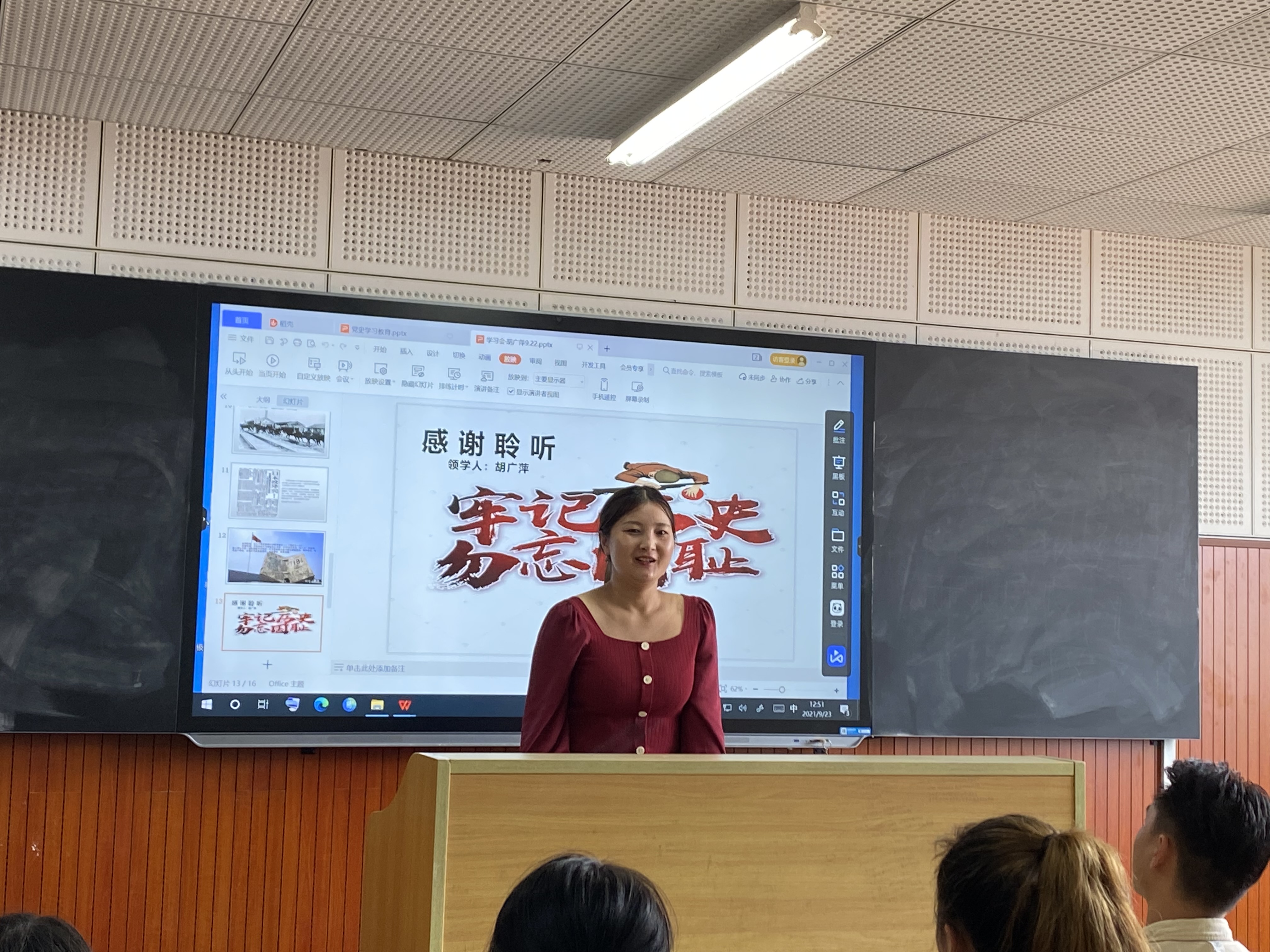 活动开始,江远强简单介绍了本周团委工作指标以及近期各部门的主要任务,并对团委的请假制度进行调整,让团干事随时随地严格要求自己。随后,胡广萍带领大家重温九一八事变,通过讲述抗联故事、英雄人物,教育引导广大青少年铭记历史、珍爱和平,勿忘国耻、振兴中华,将青春奋斗自觉融入到实现中华民族伟大复兴的新征程。最后,团学办公室张彩艳老师鼓励同学们努力学习、认真工作。永远保持一颗积极向上的心。